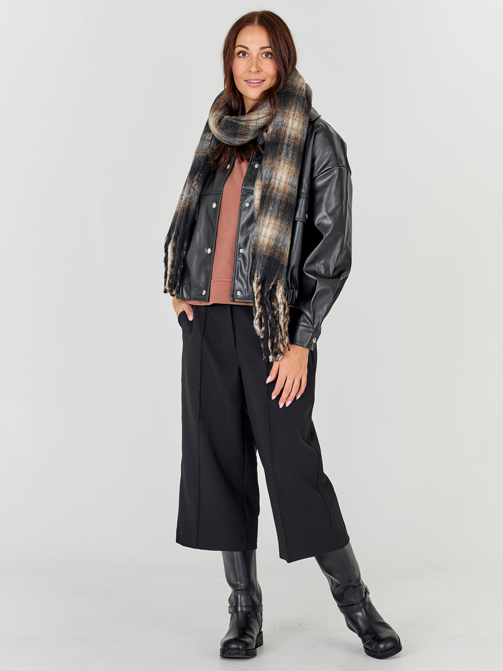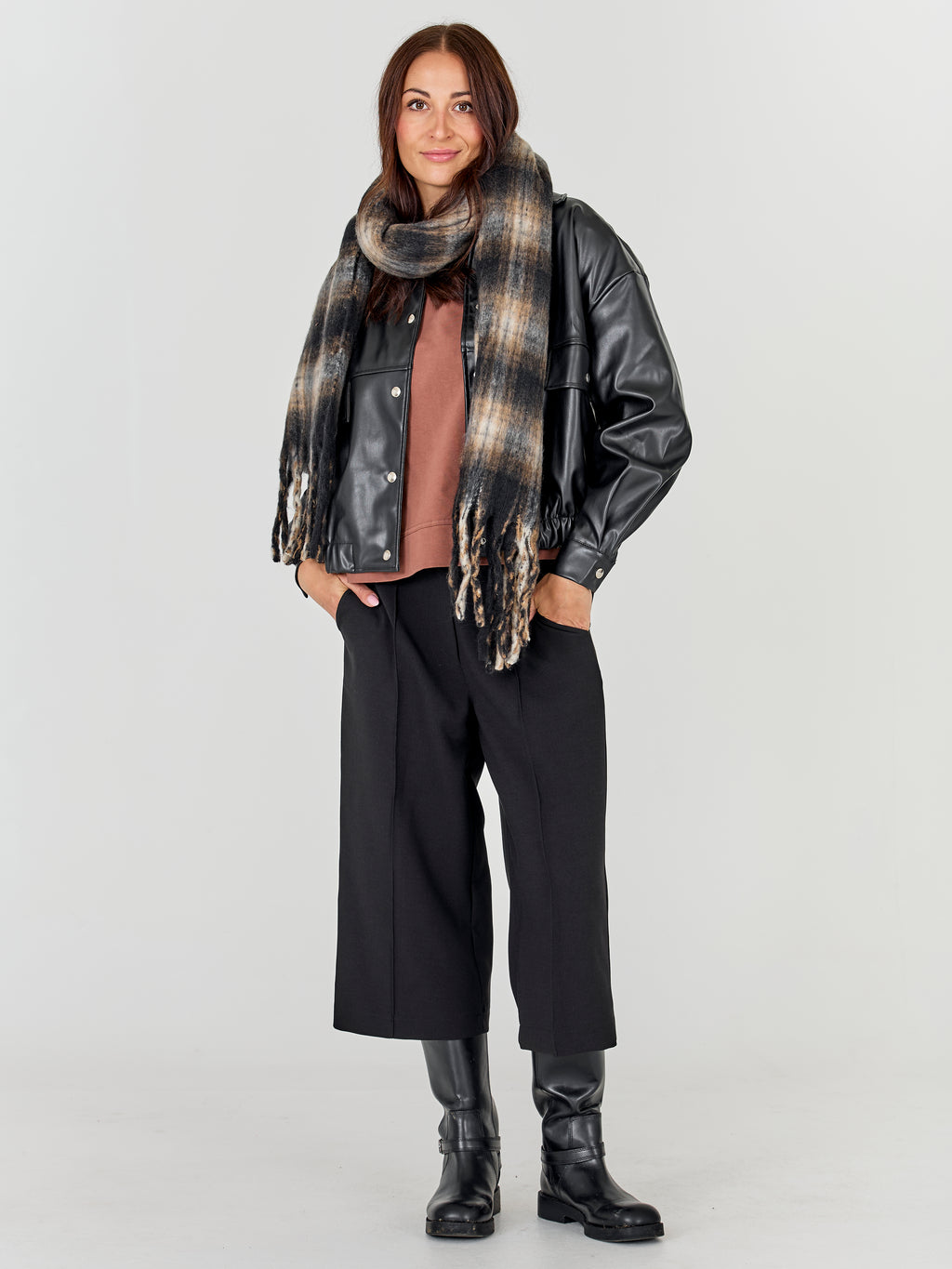 A soft and warm scarf with a classic checkered pattern and long fringes at the ends. The lightly fluffy surface provides extra comfort and adds volume when the scarf is worn around the neck.