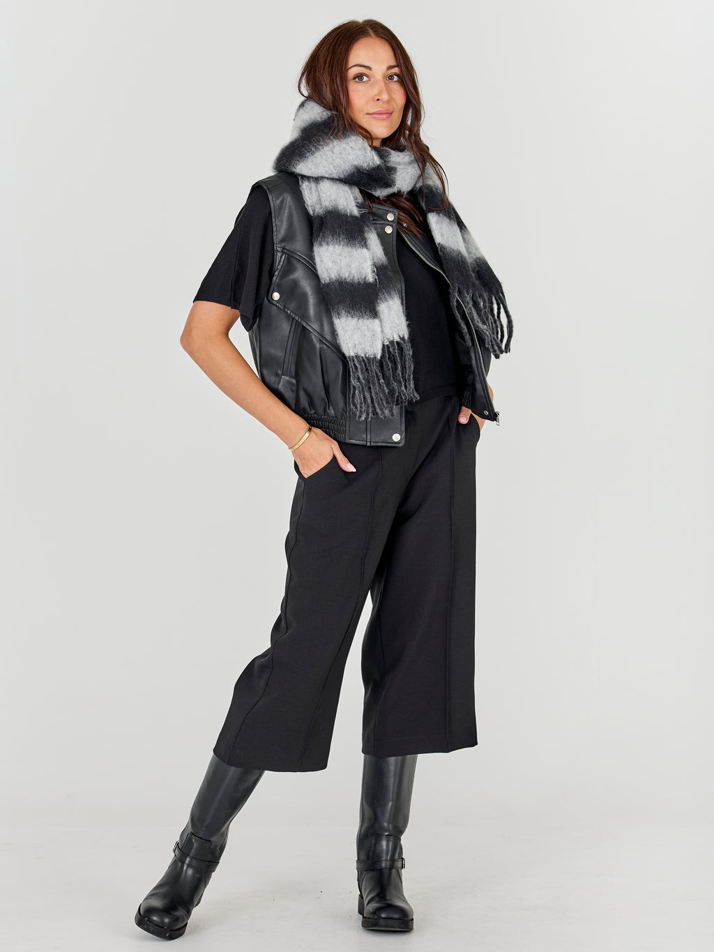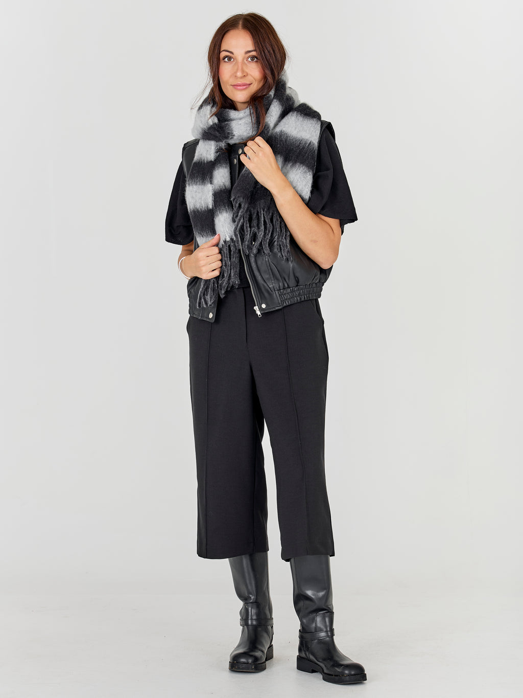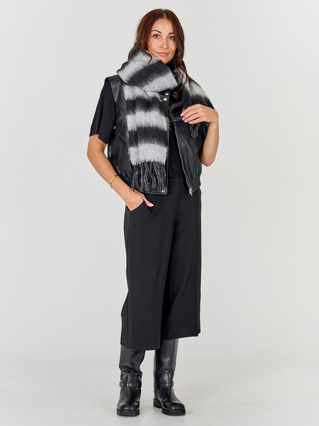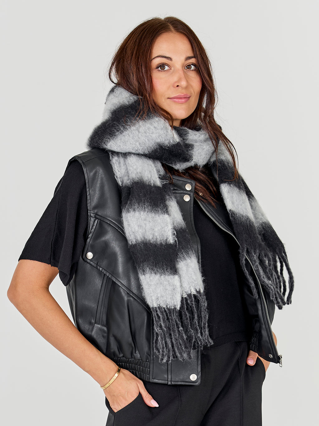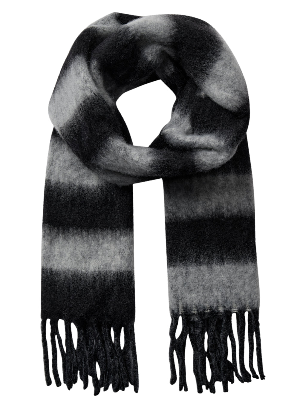 A warm and voluminous scarf with wide stripes and long fringes. The fluffy quality gives a soft expression, making the scarf extra comfortable to wear. Perfect for completing both a classic and relaxed style.