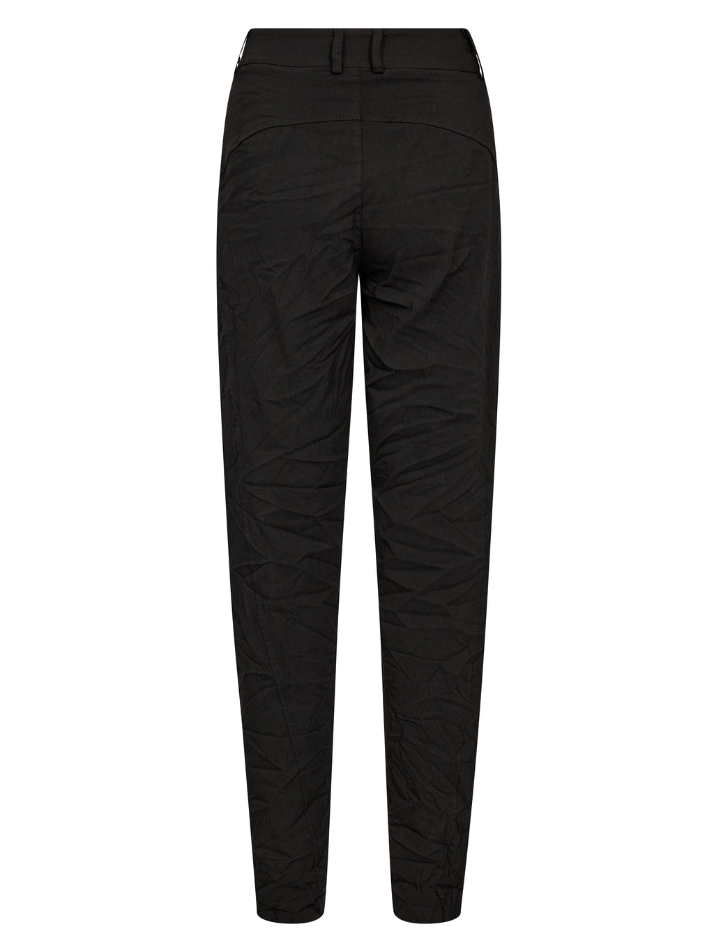 These pants are designed with a slim leg and a distinctive waistband, giving a simple and timeless look. At the front, they have a diagonal button closure and a belt with a metal ring, adding a clean and stylish detail play. At the back, the cut is clean with belt loops and markings that emphasize the fit. Style them with a lightweight knit or a shirt for a relaxed yet polished everyday look.