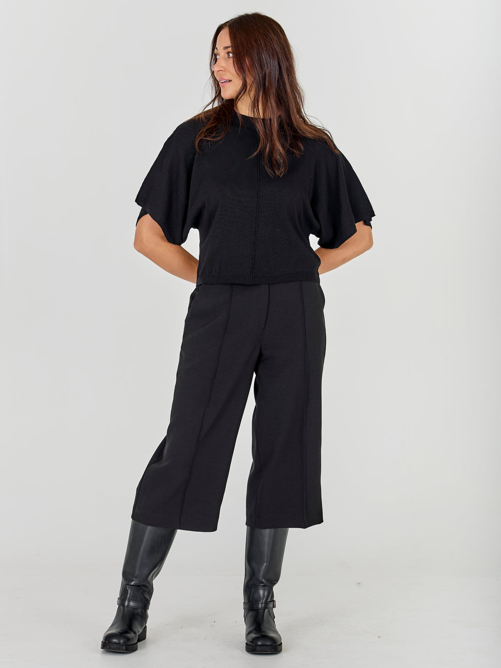 This blouse has a simple and sleek expression with a round neckline and a decorative seam running down the center front and back. The short, wide sleeves create a relaxed silhouette, while the soft knitted quality provides high comfort. The straight fit makes it easy to style for many occasions.