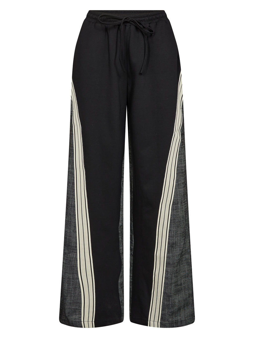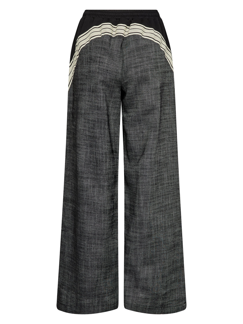 A sporty design meets structured contrast in these wide-leg trousers. The front features a smooth material with decorative stripes down the legs, while the back offers a coarser, woven quality, providing an exciting interplay. The trousers have elastic and a drawstring at the waist ensuring a good fit and high comfort.
