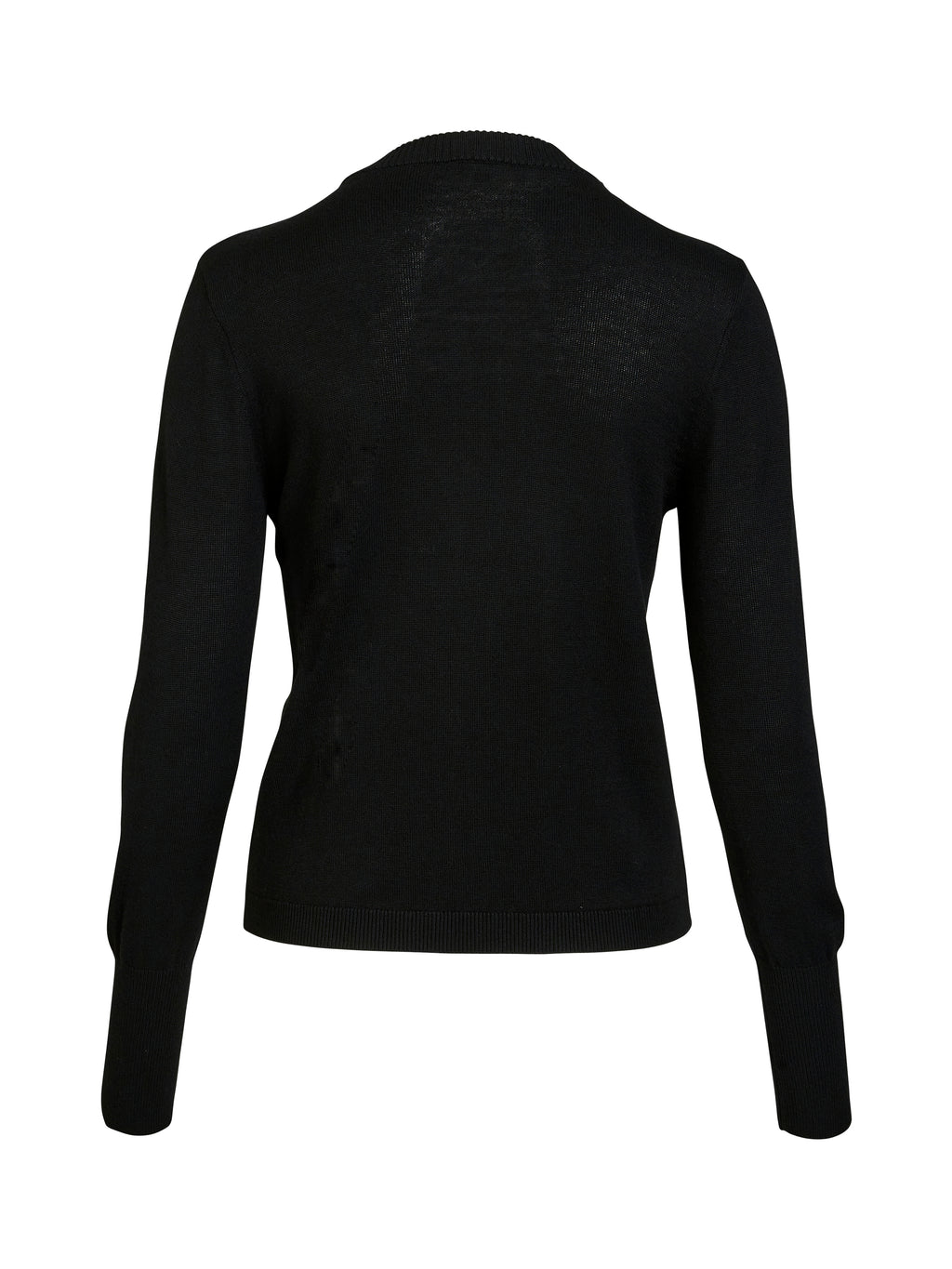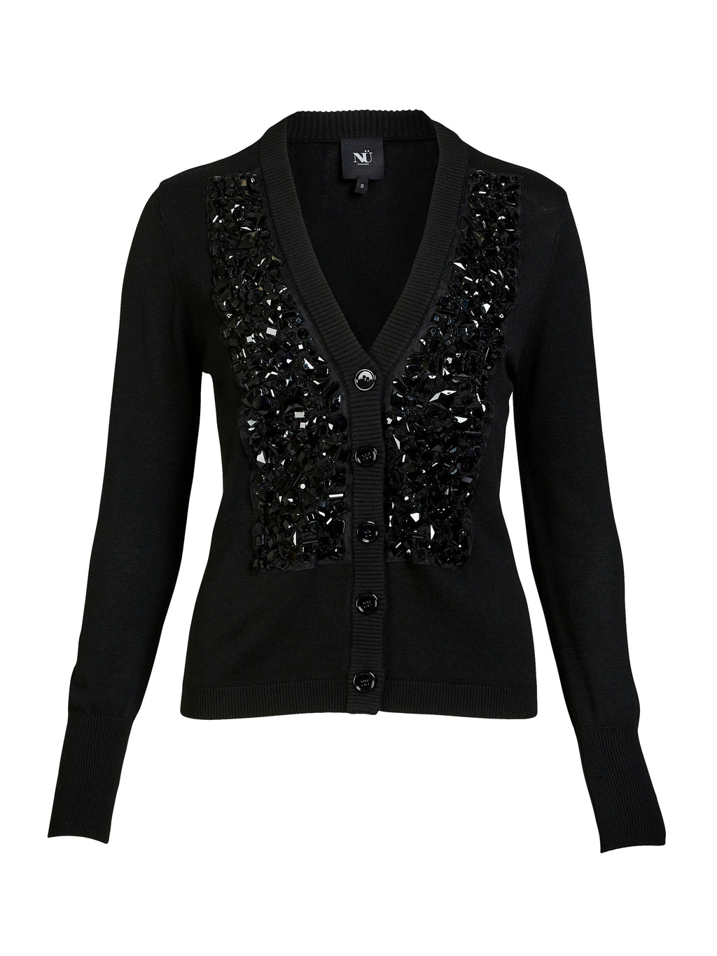 This knitted cardigan combines classic fit with festive details. It features a deep V-neck, ribbed trims, and buttons for closure at the front. The front is adorned with shiny studs and stones in various shapes, giving it an exclusive and eye-catching look.