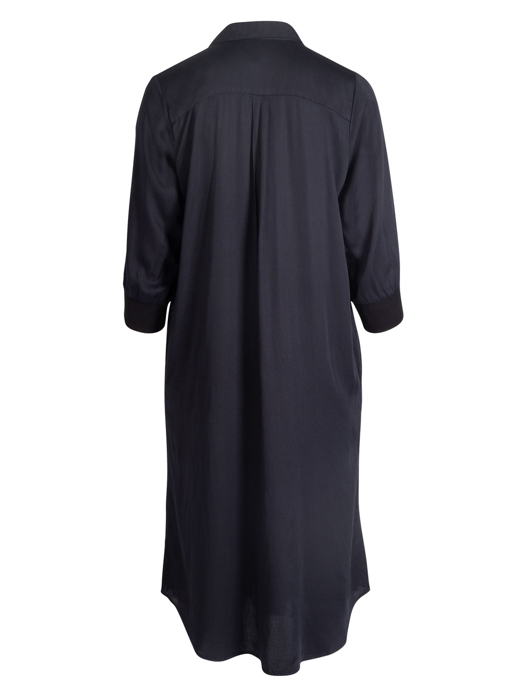 This dress combines simplicity and fine details in an elegant way. It has a straight, loose fit with buttons all the way down the front, and the 3/4-length sleeves are finished with wide cuffs. The top is decorated with tone-on-tone embroideries and small beads, adding a refined expression. The soft drape of the fabric makes it comfortable and easy to style for various occasions.