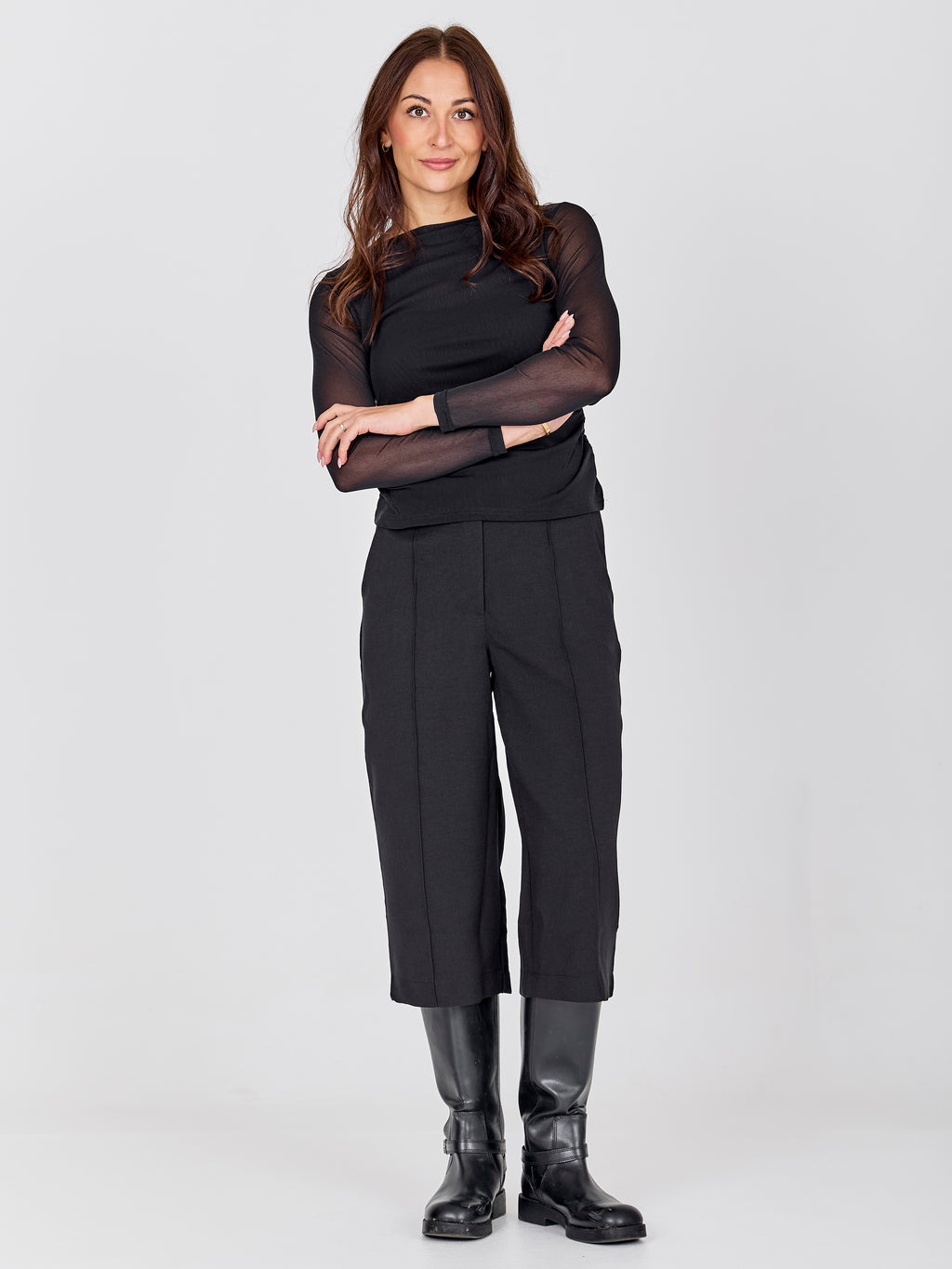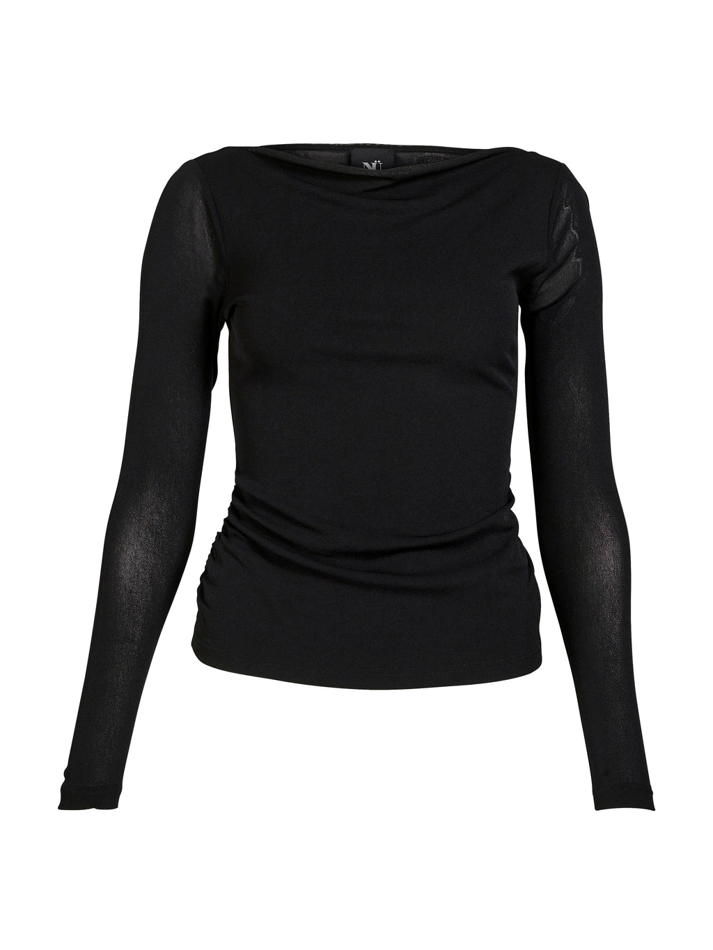 Create an elegant and simple expression with this long-sleeved t-shirt in a lightweight, transparent material. The close-fitting cut accentuates the figure, while the delicate wrinkles on the sides add subtle detail and movement. The boat-shaped neckline gives the t-shirt a feminine touch and makes it easy to style for both daytime and evening.