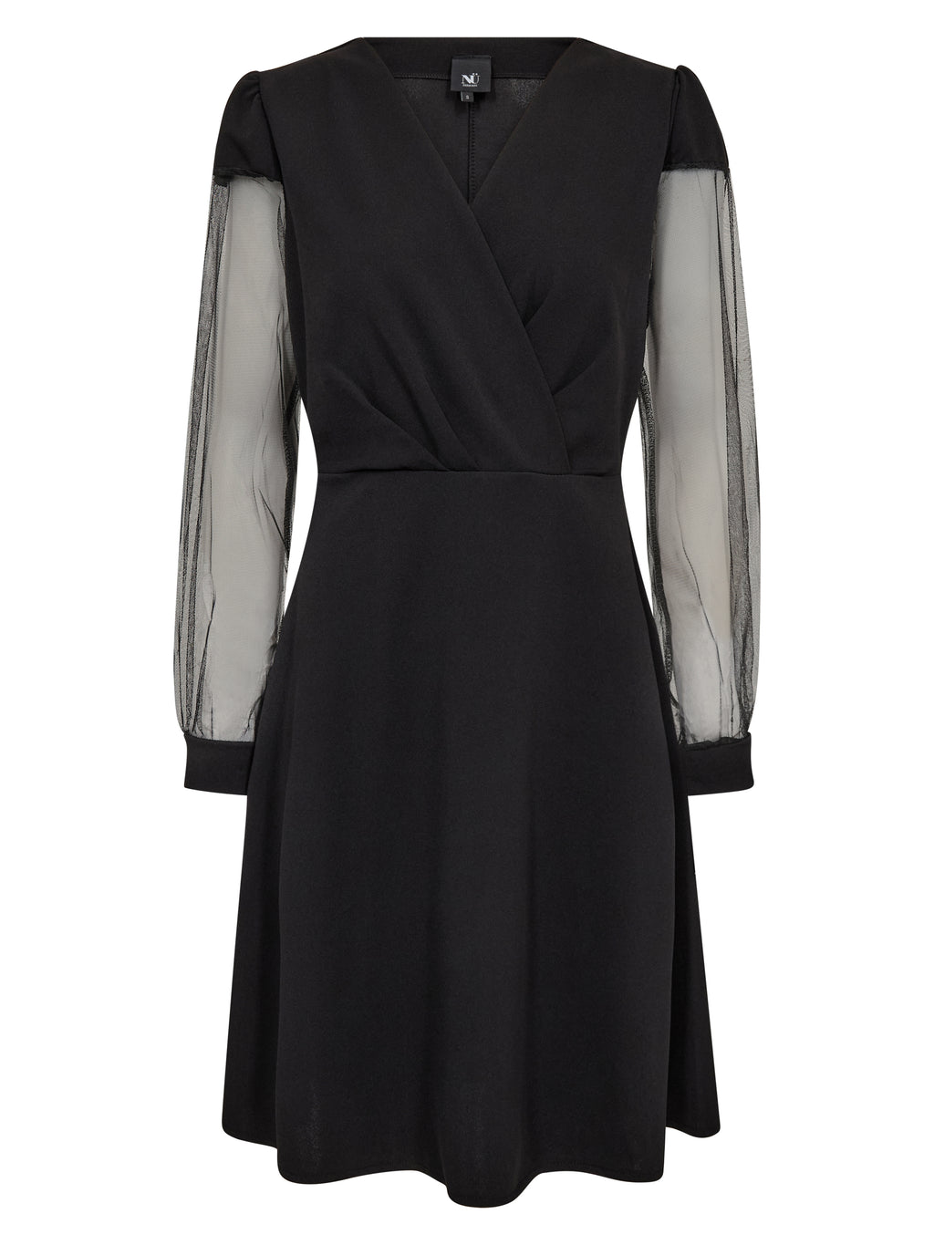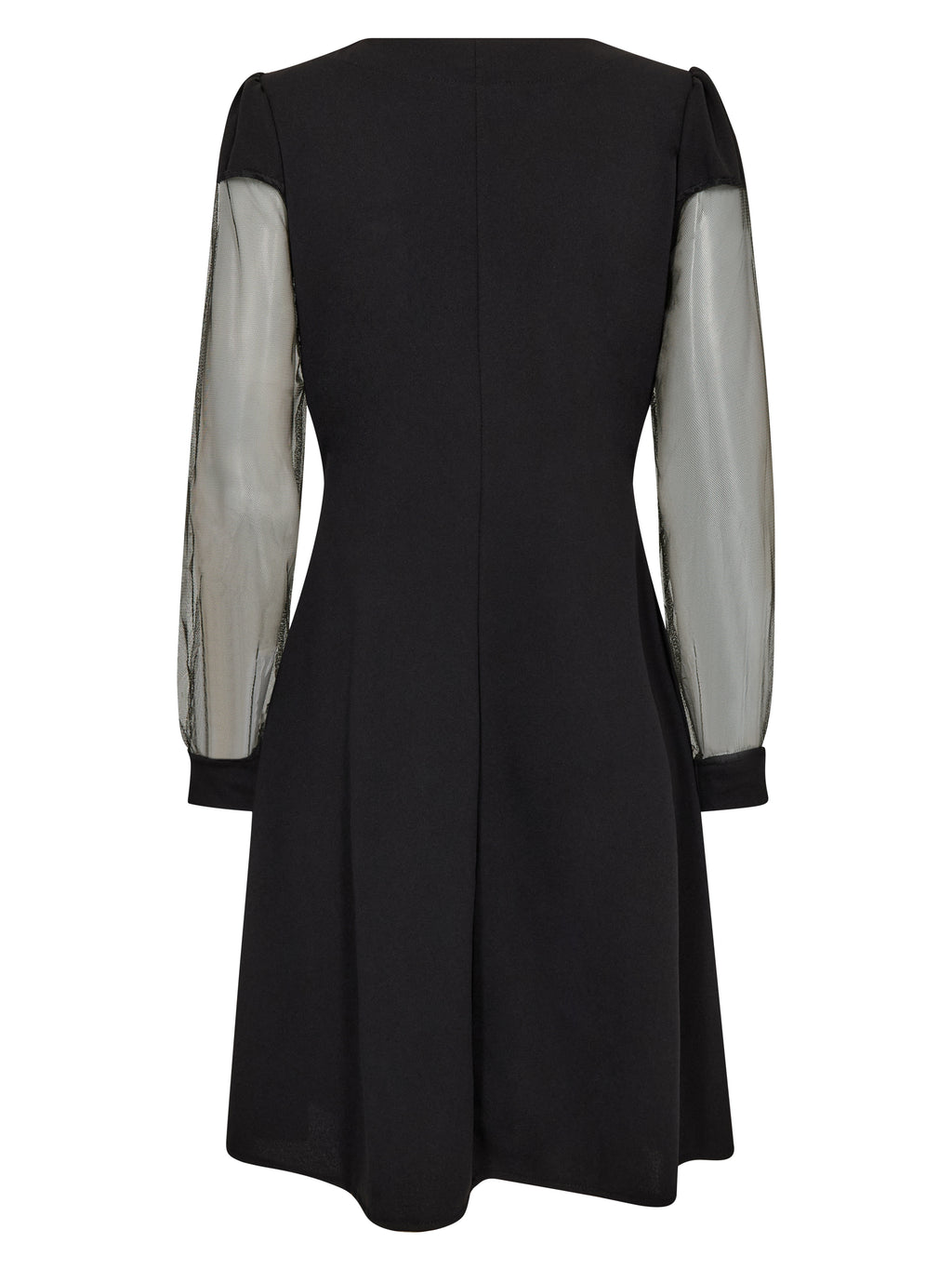 The dress features an elegant V-neckline with soft pleats at the front, giving a feminine look. The sleeves are made of light, transparent mesh and end with fixed cuffs, adding a nice contrast to the simple design. The skirt has a slight A-line and drapes softly around the body.