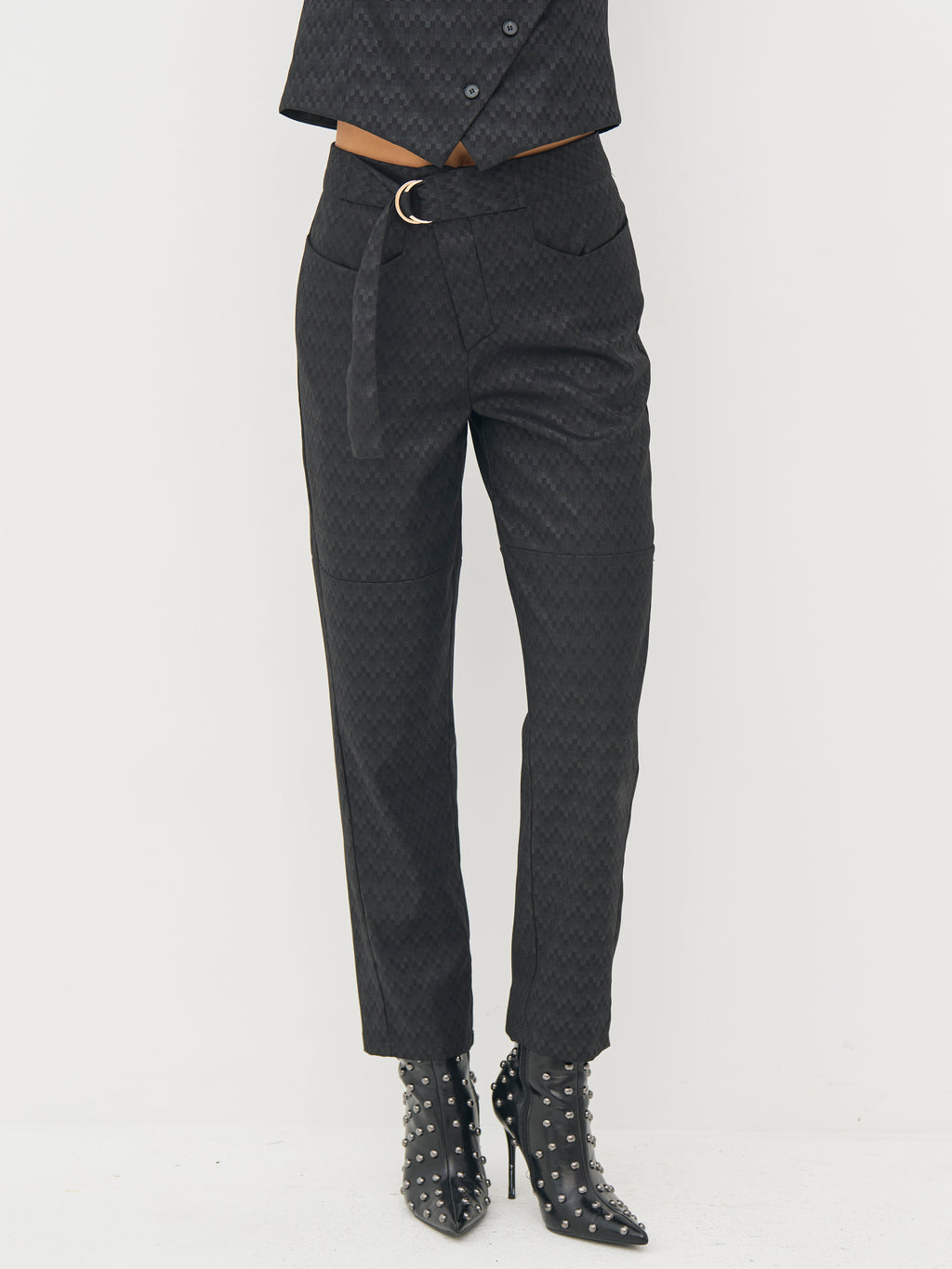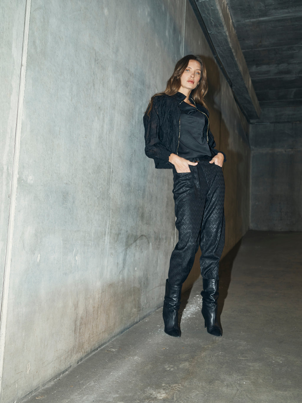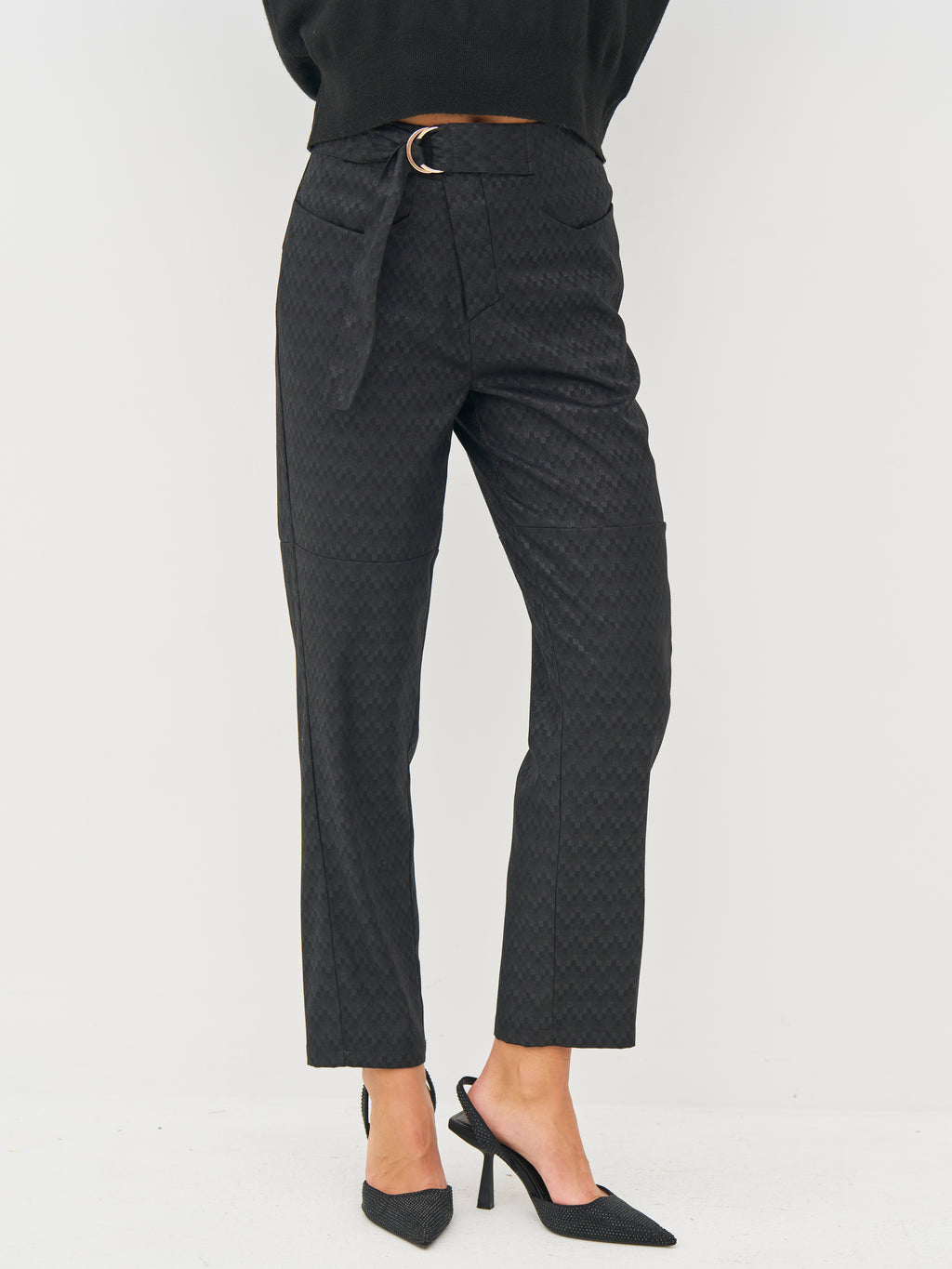 The trousers have a discreet but striking pattern, giving the fabric an exclusive expression. The straight legs and the firm waistband create an elegant silhouette, while the belt with D-ring adds a stylish element and ensures an adjustable fit. The front pockets are functional, and the welt pockets at the back complete the sophisticated design. Knee seams provide extra structure.