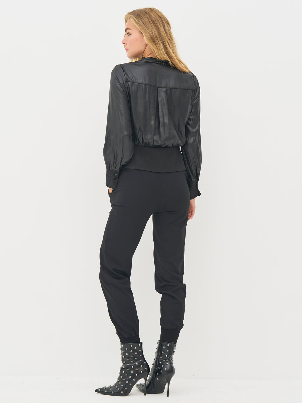 This shirt combines elegance and modern design with its shiny material and soft draping. It features a deep V-neckline, two chest pockets with flaps, and a defined waist with a wide waistband and button closure. The sleeves end with cuffs that have embroidered texture, adding a refined touch.