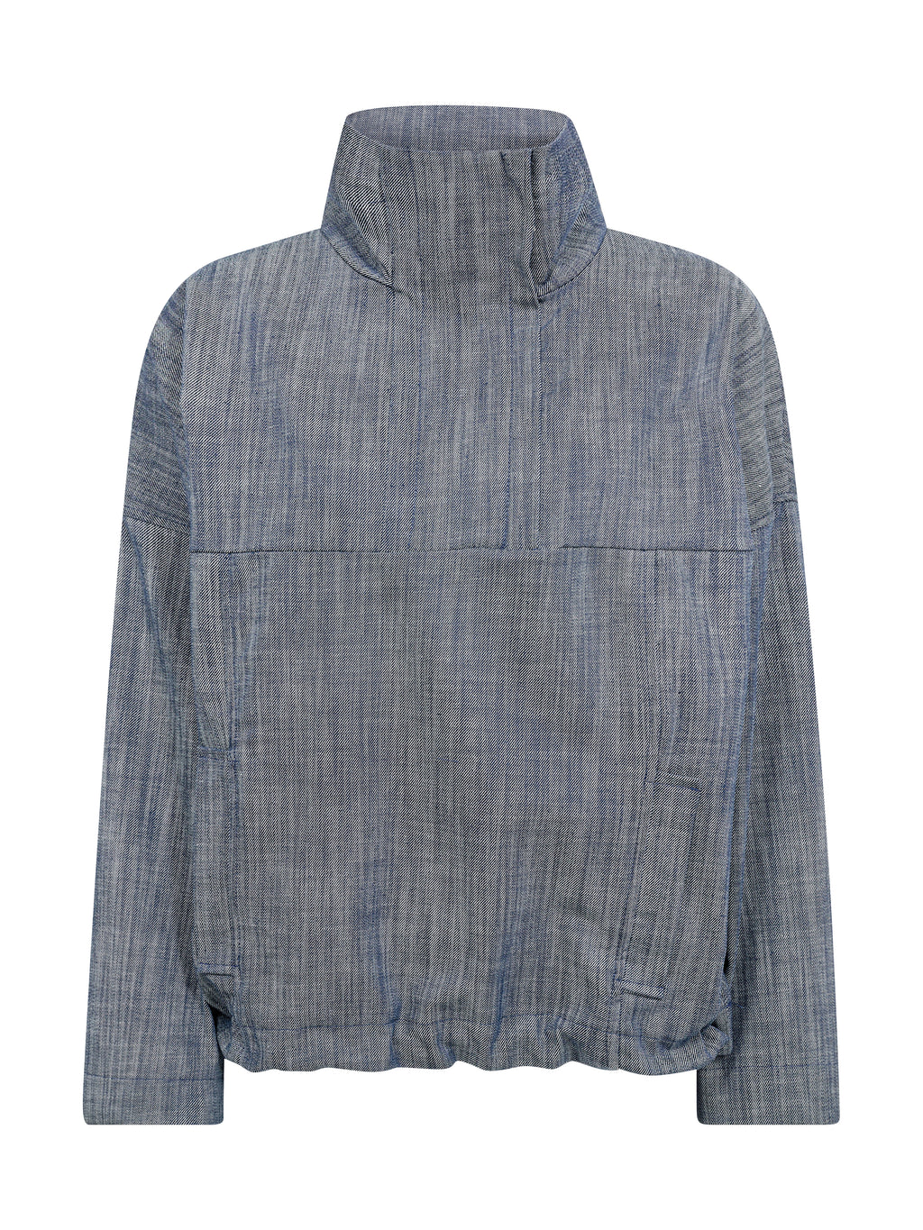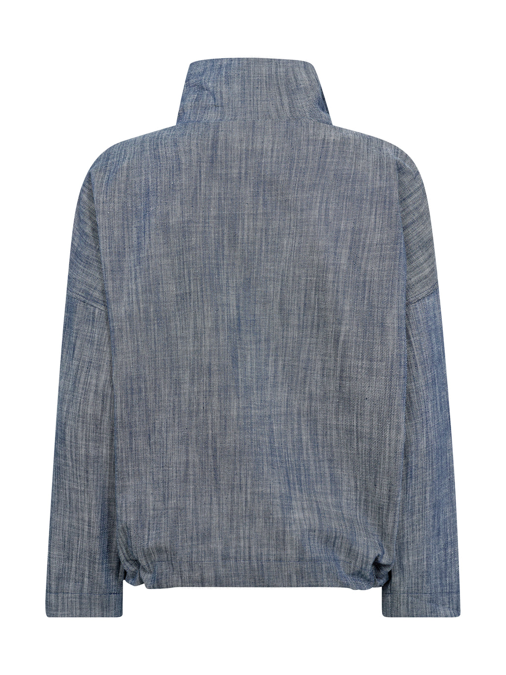 This top combines a structured material with a simple yet refined design. It features a high collar with a short zipper, wide sleeves, and a light boxy cut, which creates a relaxed yet well-dressed silhouette. The back follows the same simple expression as the front, making it easy to style across seasons.