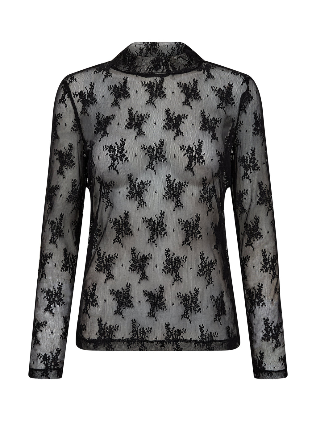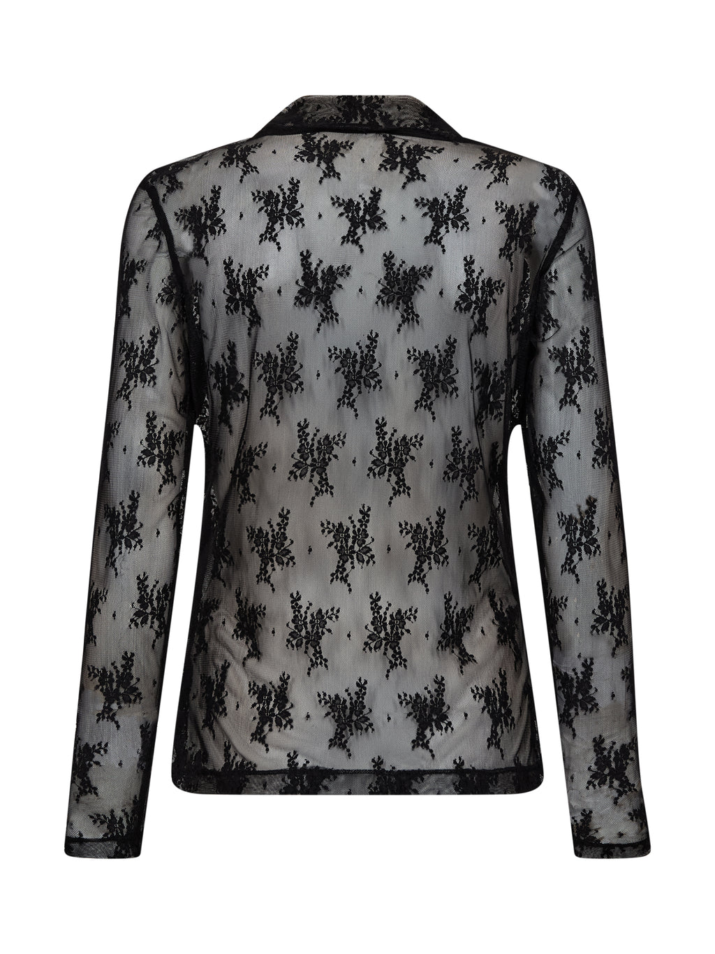 A feminine lace blouse in mesh with decorative floral embroidery all over. The tight fit and the small collar give an elegant look, while the long sleeves emphasize the light and sophisticated appearance. The blouse is the same at the front and back and can be styled layered with a knit over it, or alone with a basic top underneath.