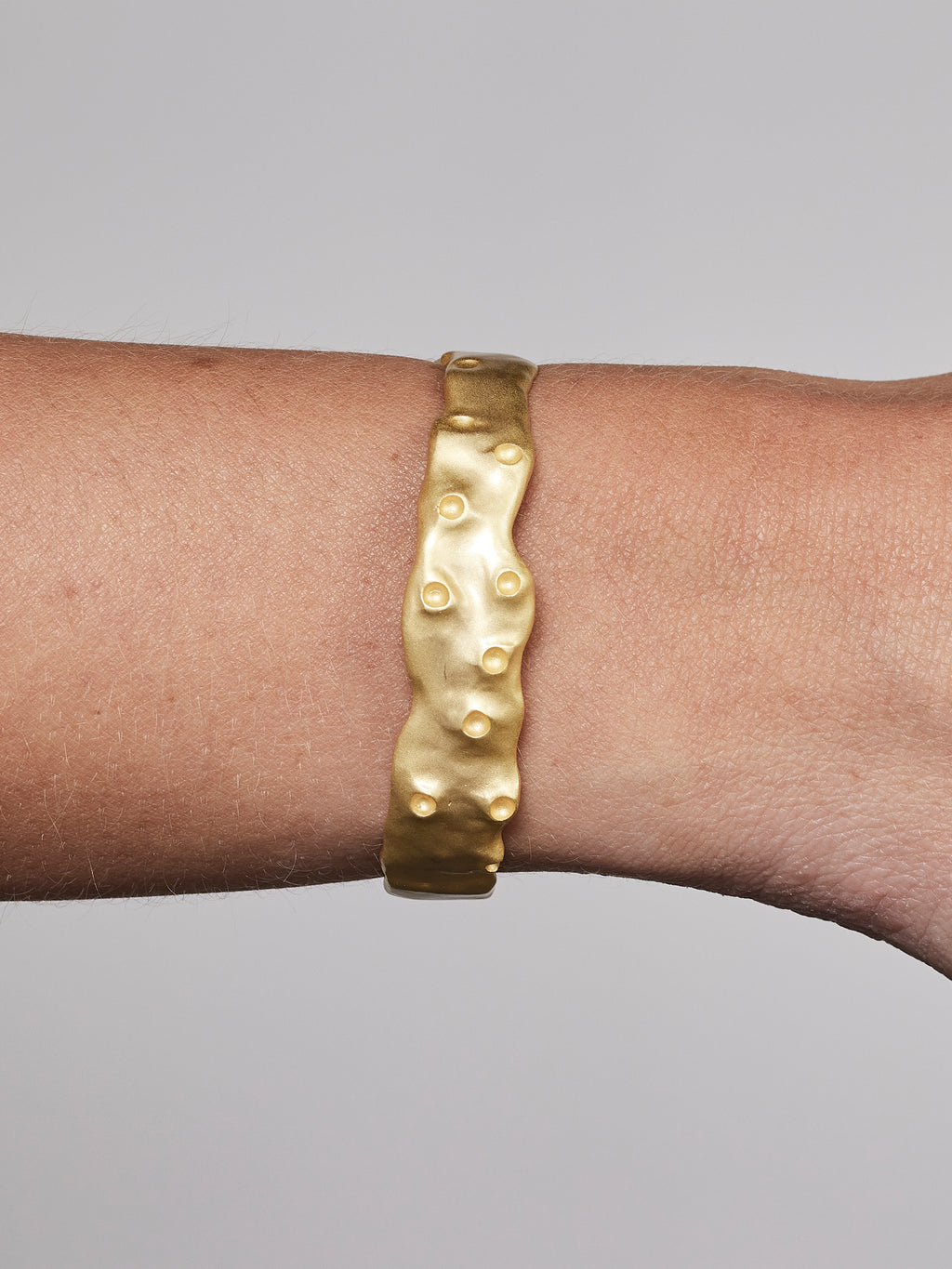 Space No. 2 is a striking bracelet that combines raw strength with aesthetics drawn directly from the unknown landscapes of space. The undulating, uneven surface is adorned with small, crater-like indentations, giving the bracelet a vivid and almost topographical expression - as if it were shaped in weightlessness on a distant planet. The matte finish softens the powerful design and creates an elegant balance between the sensual and the sculptural.