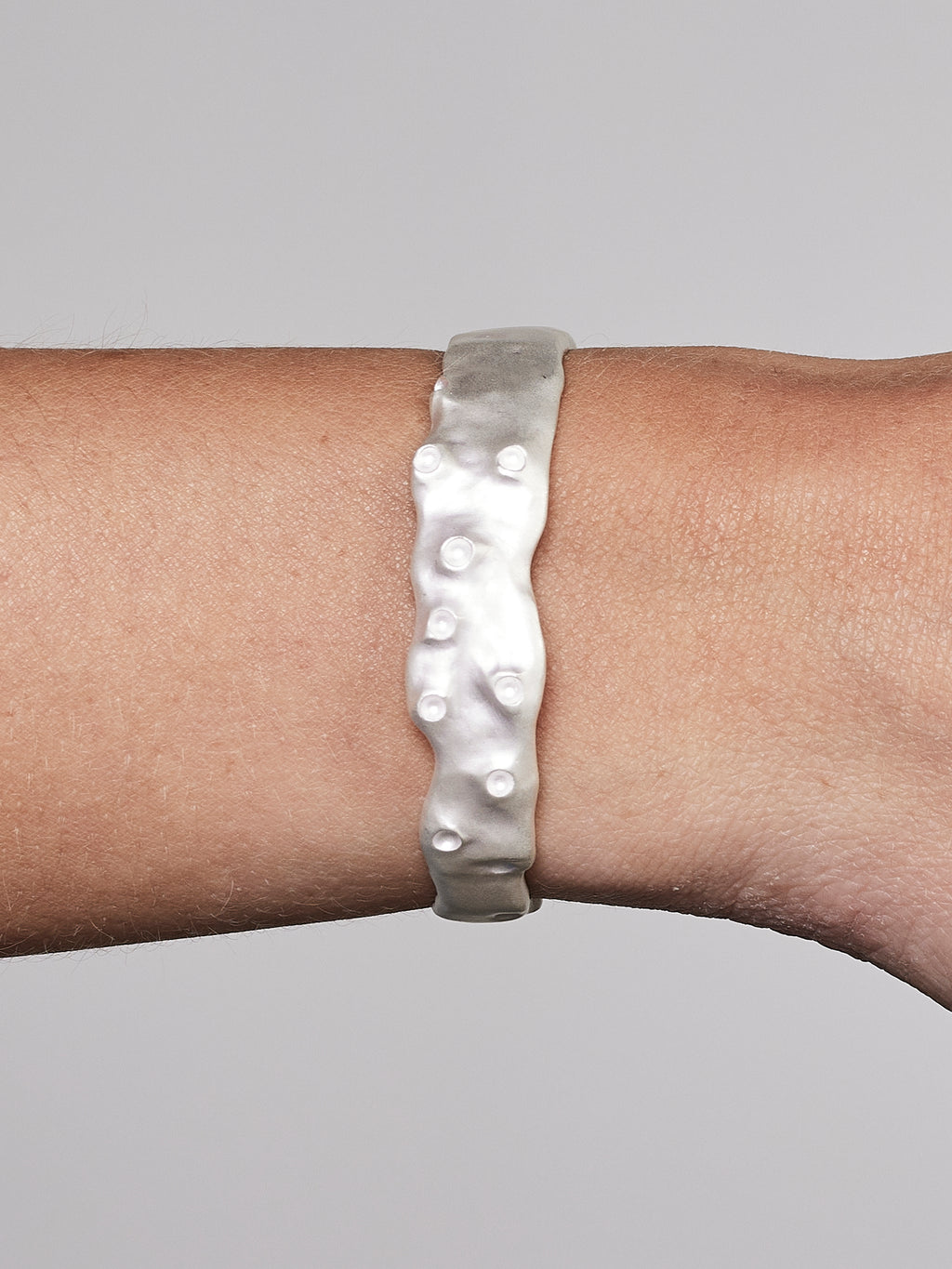 Space No. 2 is a striking bracelet that combines raw strength with aesthetics drawn directly from the unknown landscapes of space. The undulating, uneven surface is adorned with small, crater-like indentations, giving the bracelet a vivid and almost topographical expression - as if it were shaped in weightlessness on a distant planet. The matte finish softens the powerful design and creates an elegant balance between the sensual and the sculptural.