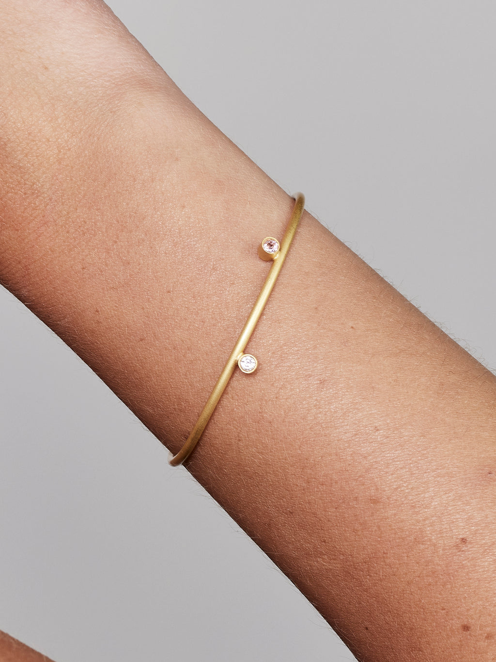 Planets No. 2 is a minimalist bracelet that draws its inspiration from the calm geometry of the starry sky. The open shape rests lightly on the wrist, while two sparkling zircons – one clear and one in delicate pink – balance precisely at each end like two planets in orbit. The matte metal gives the design a soft depth and emphasizes the simple, precise design language.