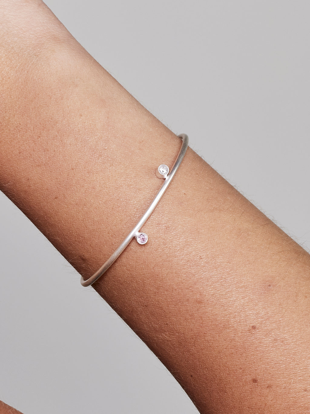 Planets No. 2 is a minimalist bracelet that draws its inspiration from the calm geometry of the starry sky. The open shape rests lightly on the wrist, while two sparkling zircons – one clear and one in delicate pink – balance precisely at each end like two planets in orbit. The matte metal gives the design a soft depth and emphasizes the simple, precise design language.