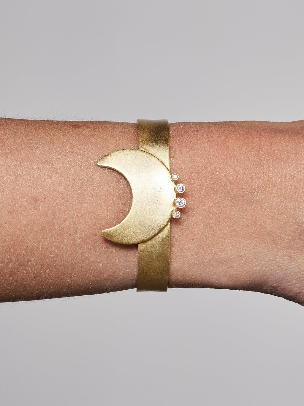 Moons No. 1 is a powerful bracelet that celebrates the moon's quiet presence and its eternal cycle. The wide, matte band carries a large crescent moon shape in the center, topped with five clear zircons that shine like stars above a nighttime horizon. The geometric design language gives the bracelet a sculptural calmness and an almost ritualistic character.