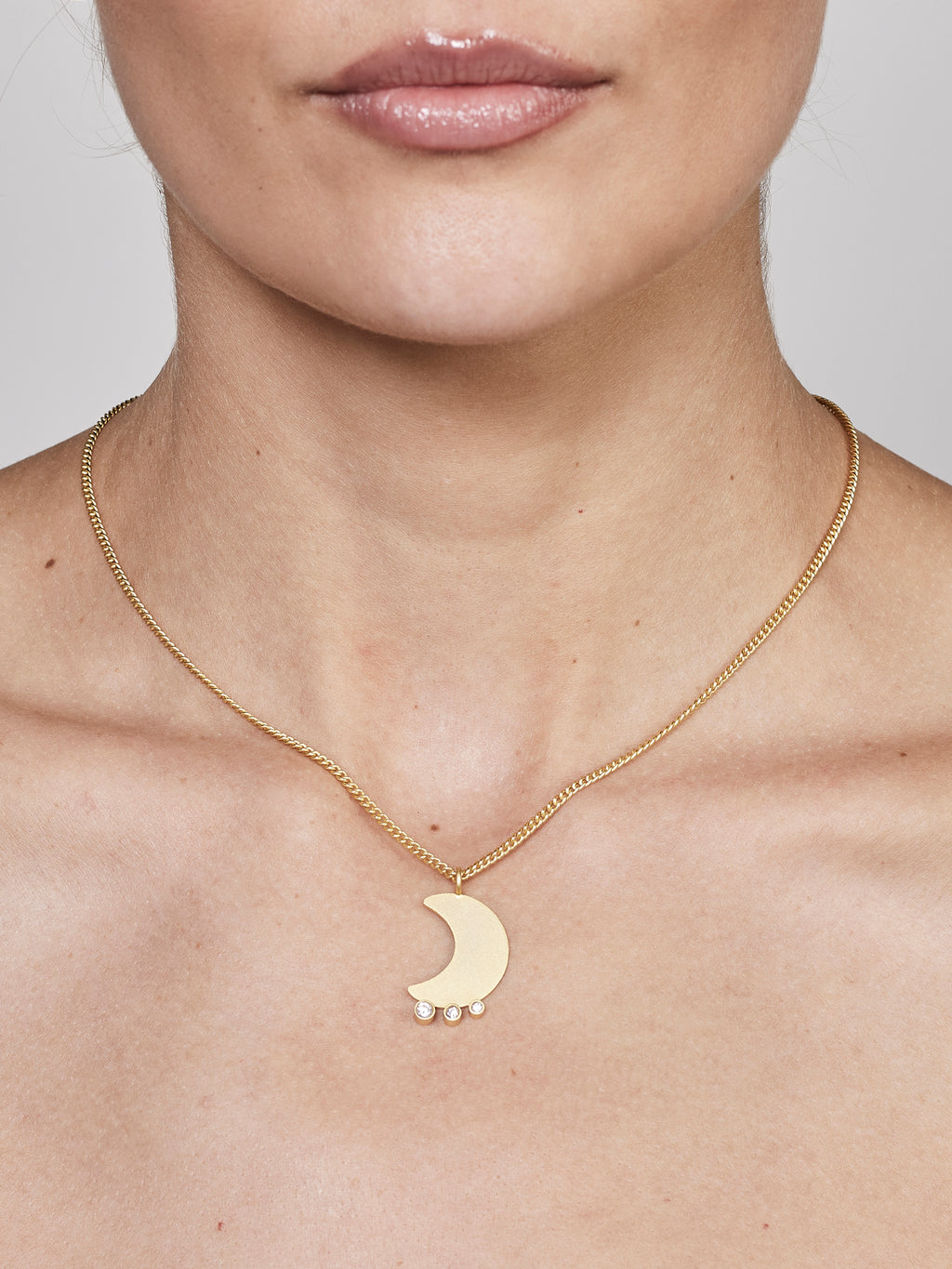 Like a stylized moon, this pendant floats in a gentle arc, surrounded by three sparkling zircons symbolizing planets orbiting around the moon. The matte surface gives the moon a soft and dreamy expression, while the clear stones add a touch of elegance and movement to the piece.