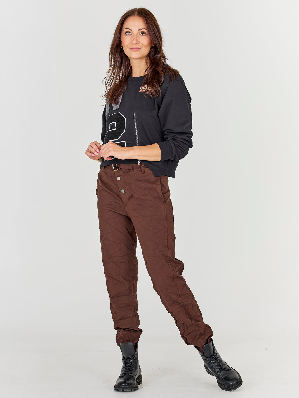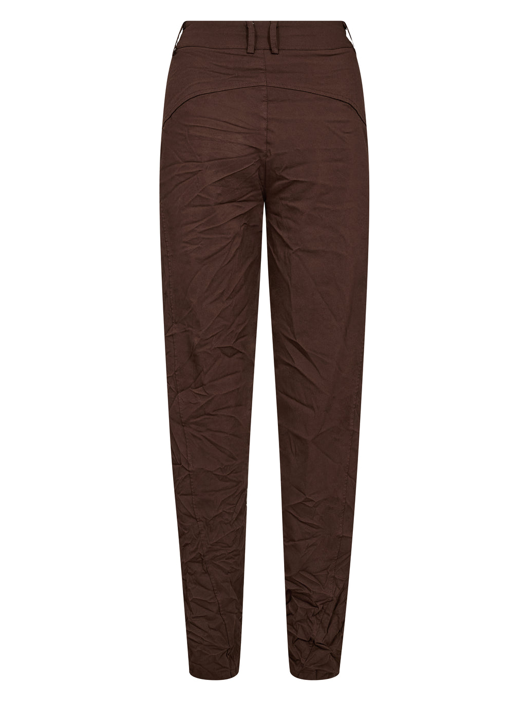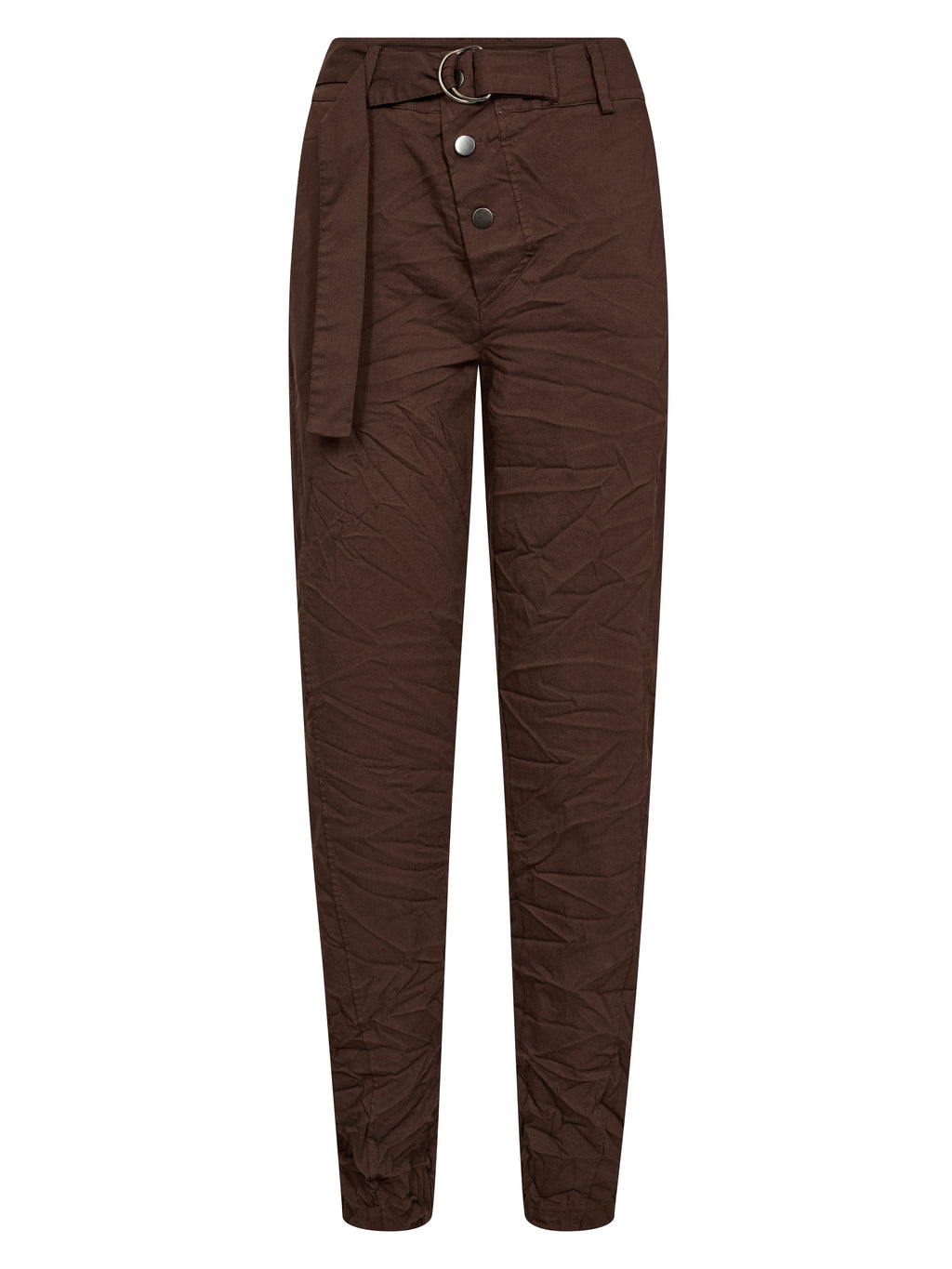 These pants are designed with a slim leg and a distinctive waistband, giving a simple and timeless look. At the front, they have a diagonal button closure and a belt with a metal ring, adding a clean and stylish detail play. At the back, the cut is clean with belt loops and markings that emphasize the fit. Style them with a lightweight knit or a shirt for a relaxed yet polished everyday look.