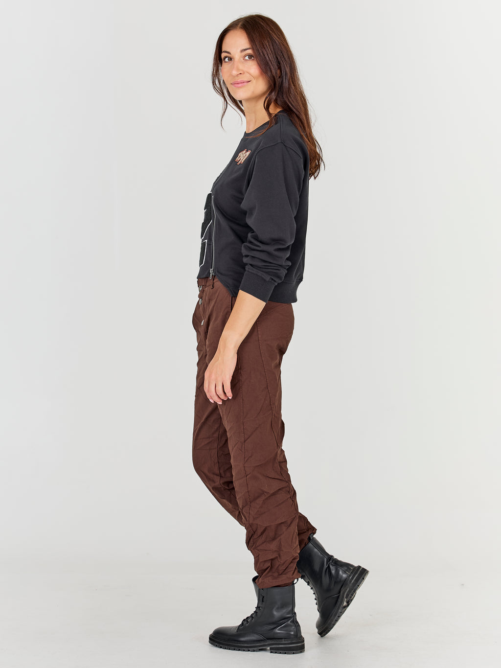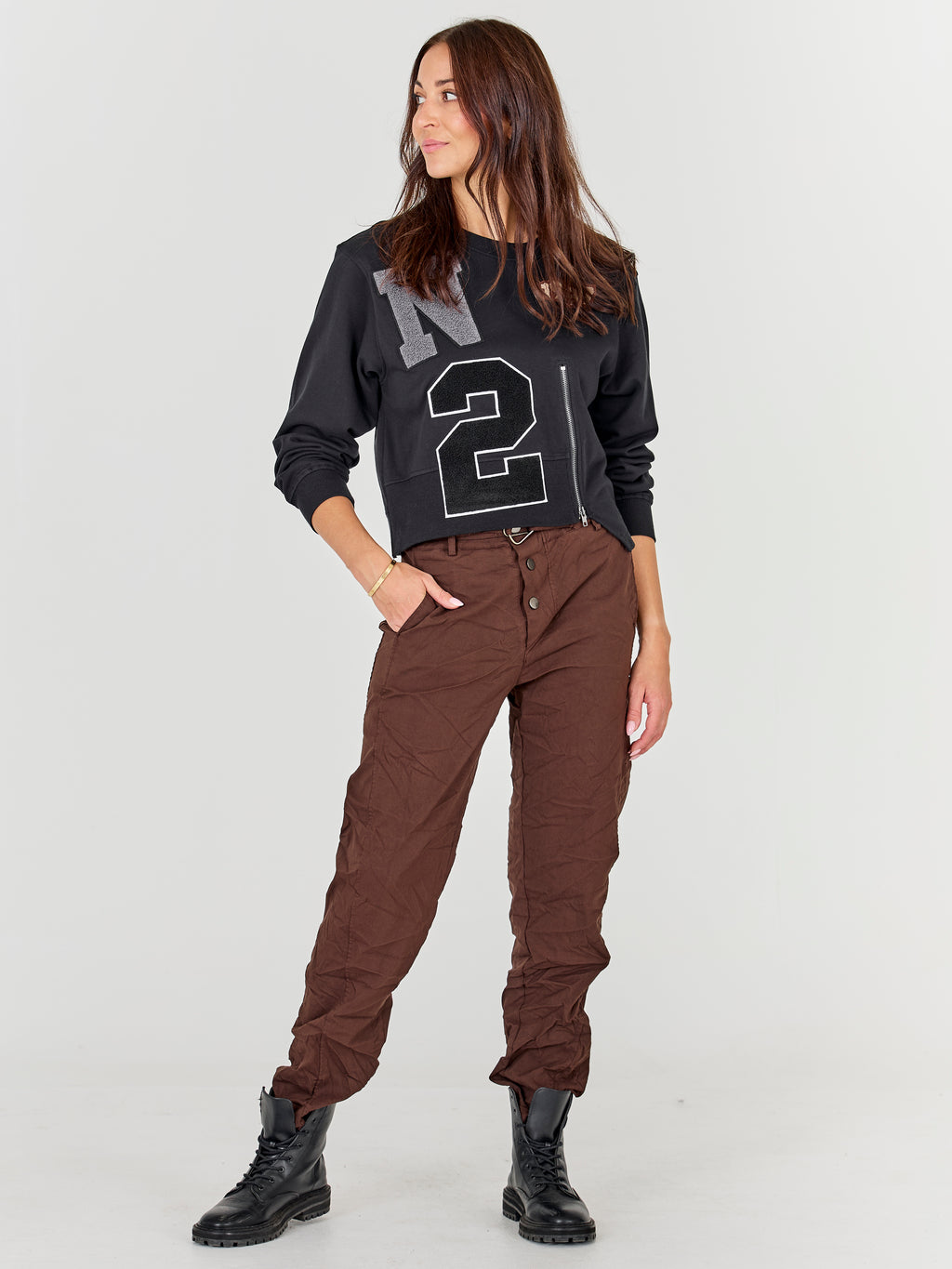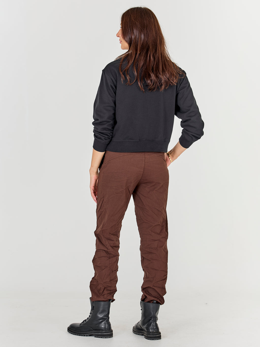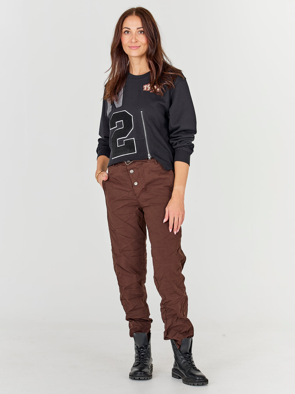 These pants are designed with a slim leg and a distinctive waistband, giving a simple and timeless look. At the front, they have a diagonal button closure and a belt with a metal ring, adding a clean and stylish detail play. At the back, the cut is clean with belt loops and markings that emphasize the fit. Style them with a lightweight knit or a shirt for a relaxed yet polished everyday look.