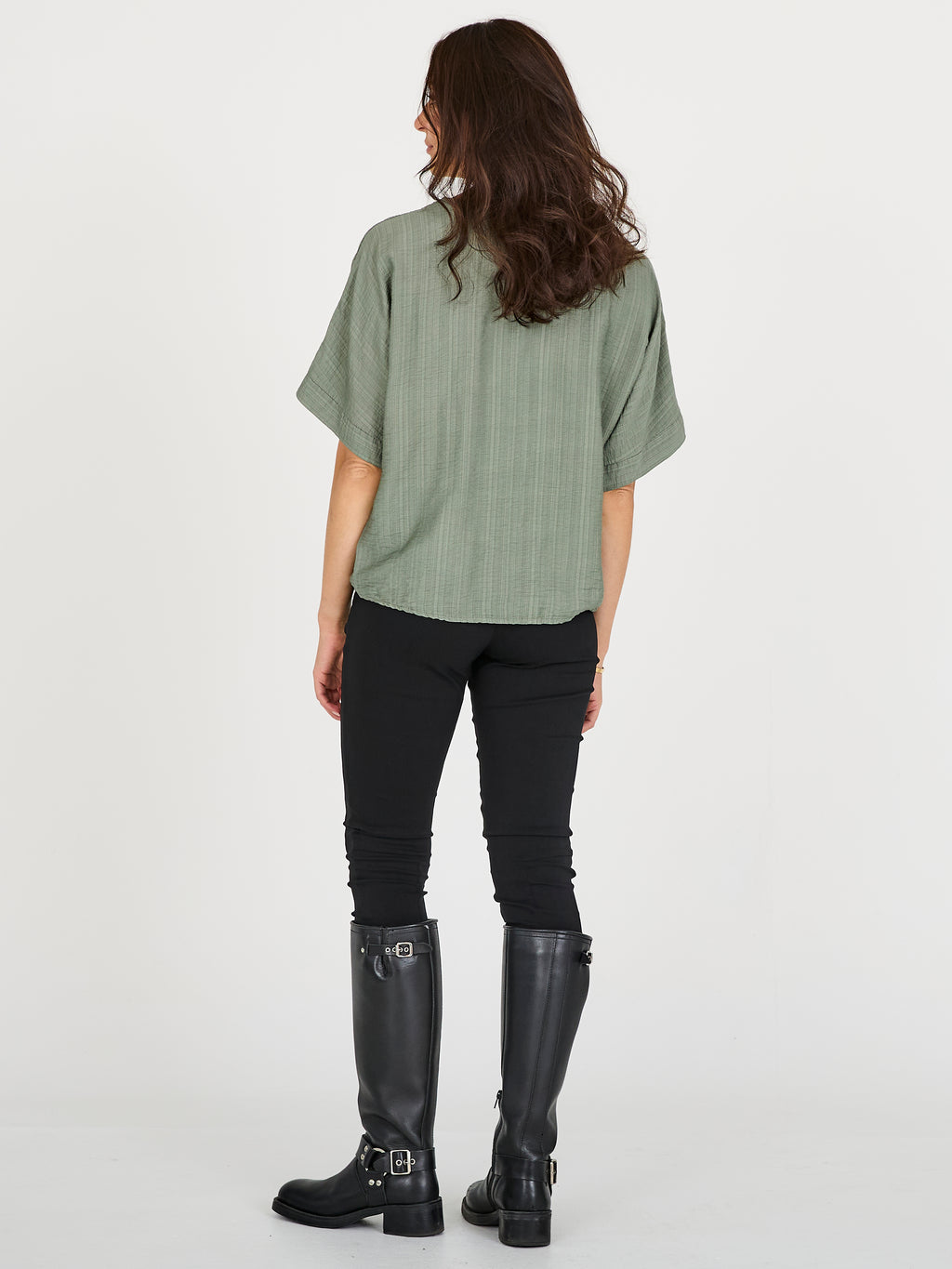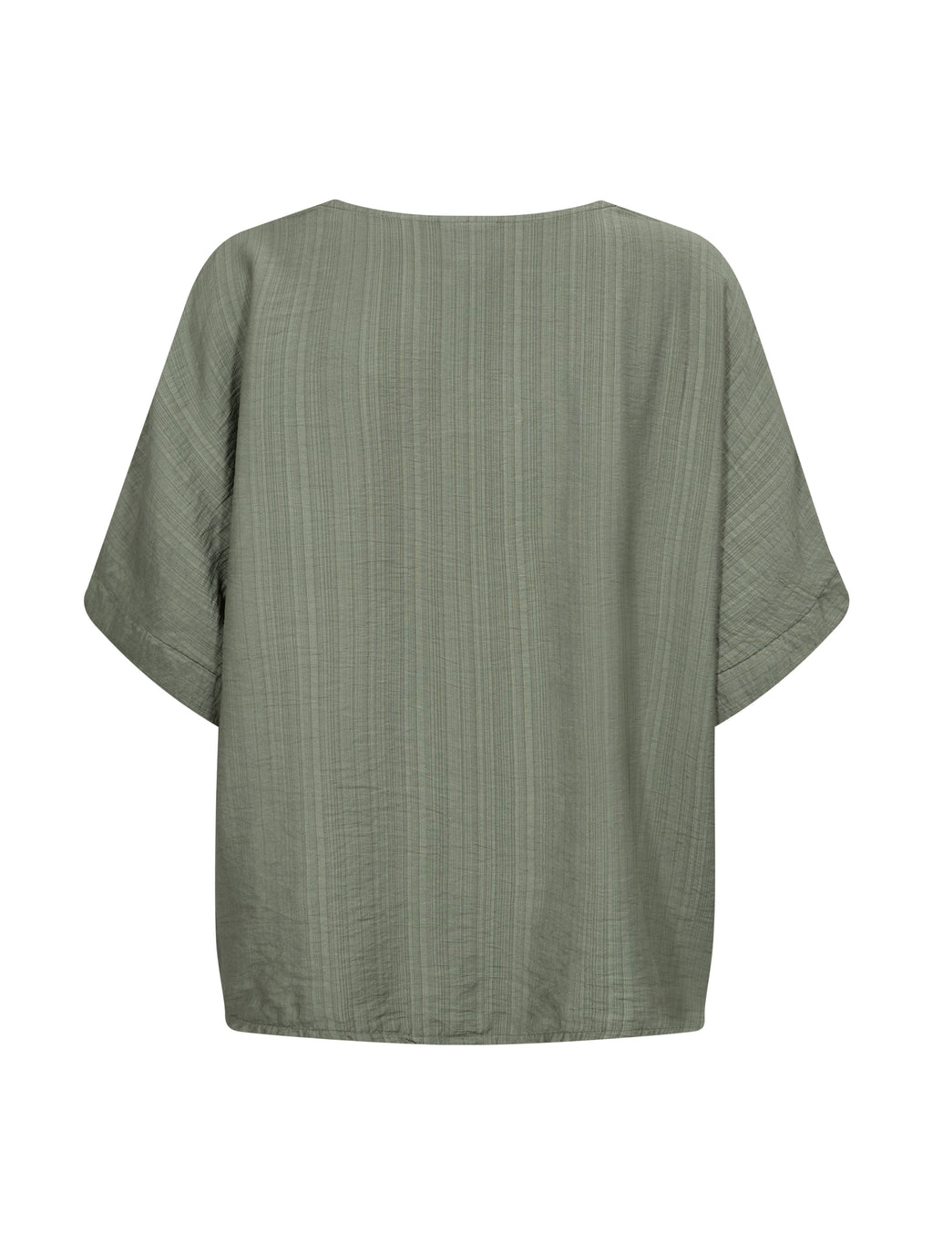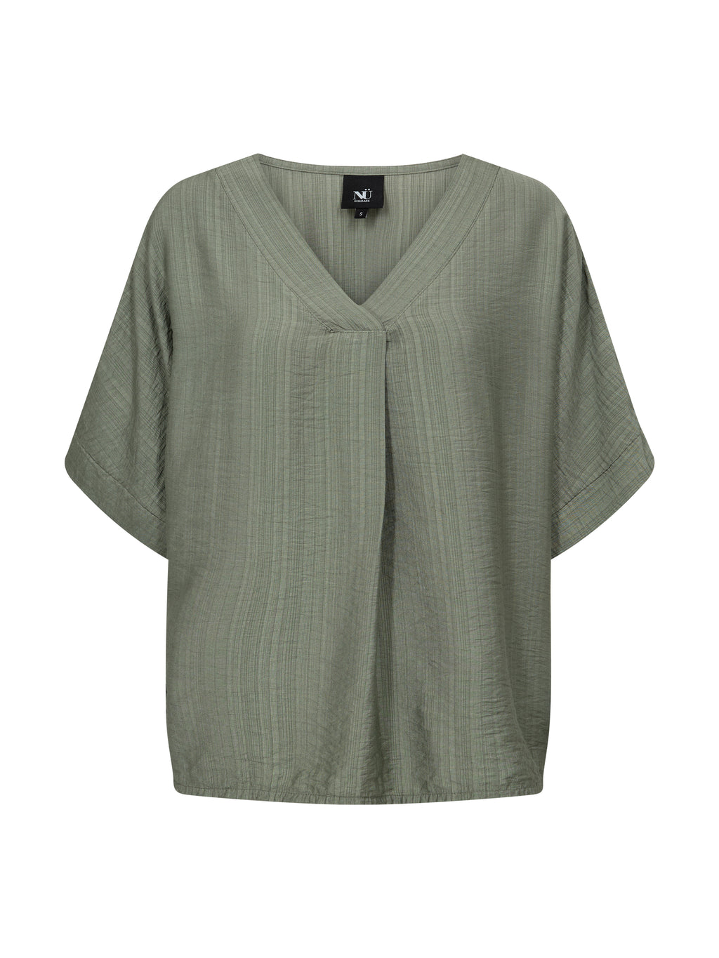 This airy blouse combines comfort and simplicity with its lightly structured material and relaxed fit. It features short, loose-fitting sleeves and a V-neckline with a decorative fold in the front, adding a soft focal point to the design. The wide sleeve edge gives the blouse a subtle lift and rounds off the relaxed look.