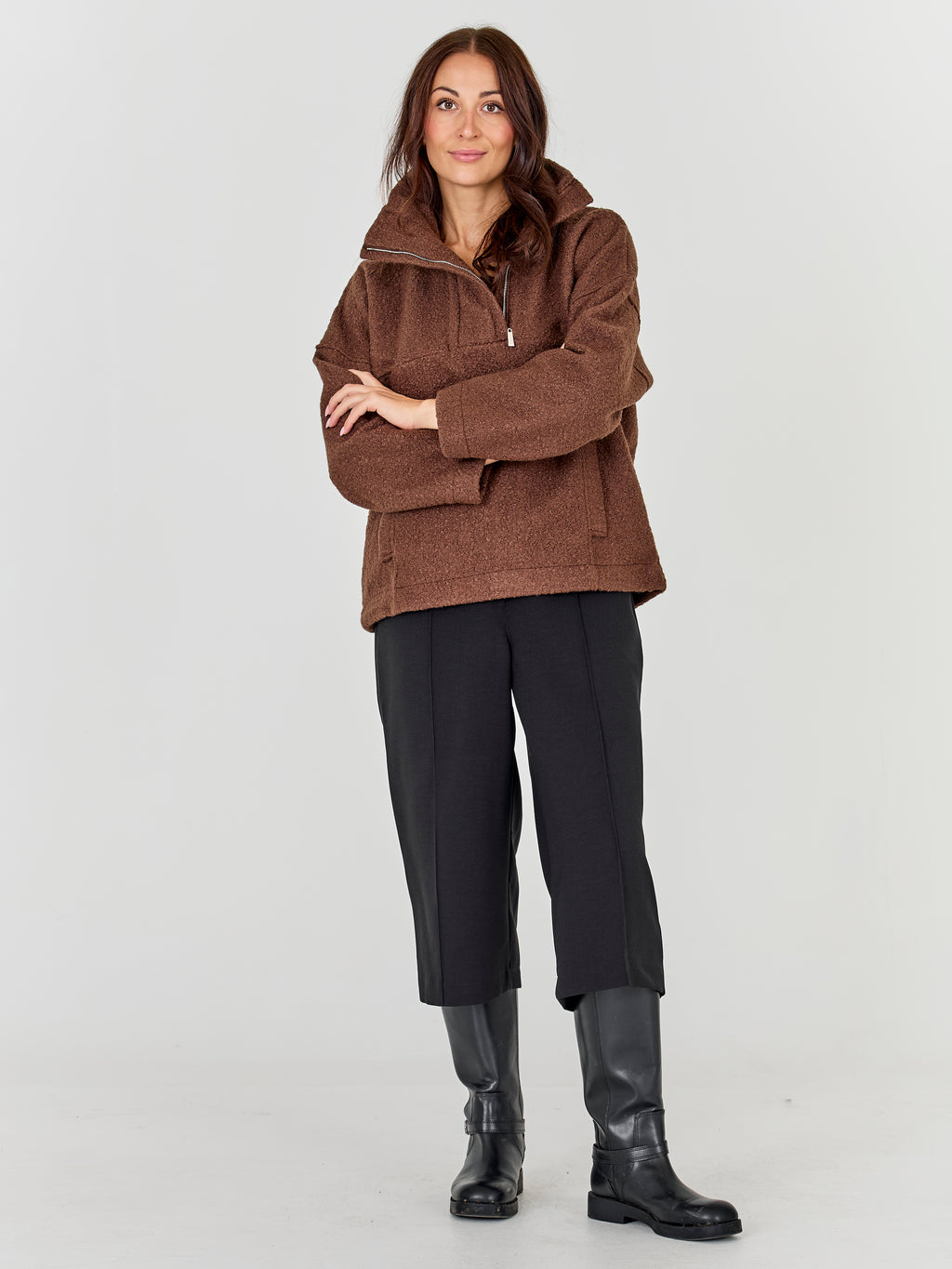 This sweater has a soft and textured bouclé material, giving it a modern and cozy expression. The relaxed fit and high collar with a half-zip zipper add both style and functionality. The long sleeves and light volume make it ideal for layered looks.