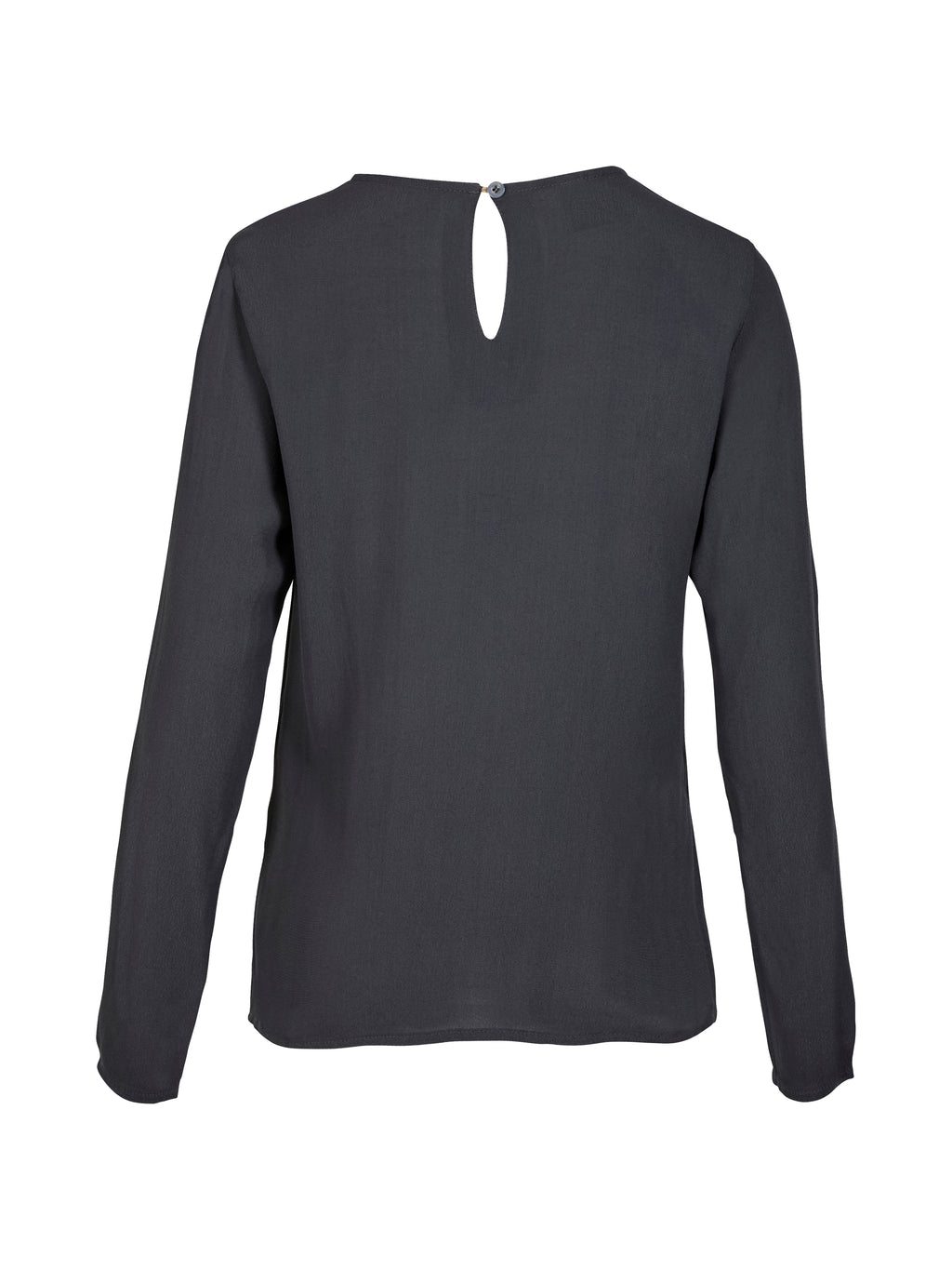 Elevate your outfit with this elegant blouse that combines simplicity and refined details. The front features soft pleats and a wide insert at the waist, creating a flattering silhouette. The round neckline and long sleeves make it suitable for both everyday wear and formal occasions. A small keyhole opening with a button closure at the back completes the feminine expression.