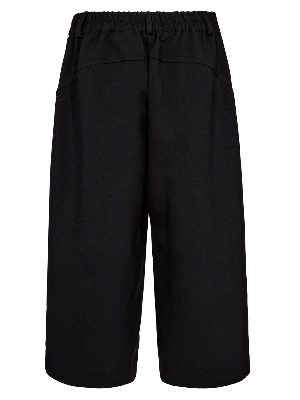 These shorts have a loose fit and a length that hits mid-calf, creating a modern and airy look. They feature front pleats, slant pockets, and an asymmetric button closure at the waist. The elastic waistband in the back ensures comfort and freedom of movement.