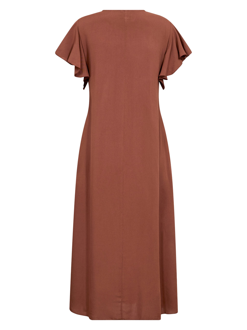 The dress has a soft and feminine cut with a v-neck and a small delicate sleeve. A narrow elastic band at the front creates a flattering silhouette and provides a natural flow. The back is simple and smooth, emphasizing the dress's clean look. The lightweight materials and loose fit make it comfortable to wear all day.