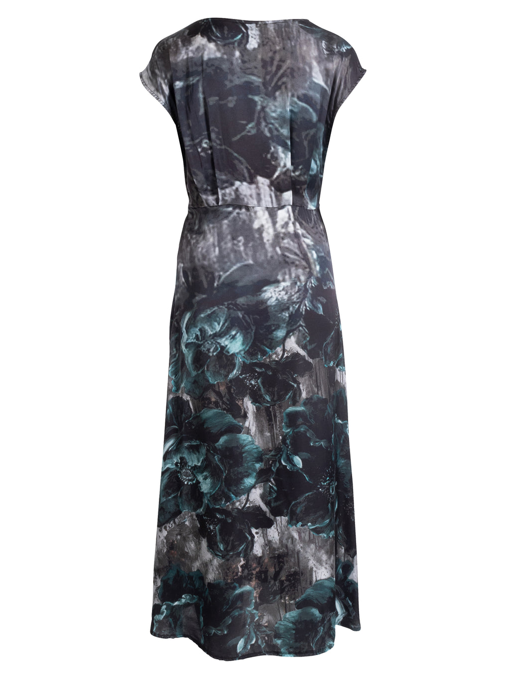 An elegant choice for both everyday wear and festive occasions. This long dress has a beautiful drape and a feminine cut with a lightly defined waist. The soft fabric follows the body in a flattering way, while the eye-catching floral print adds depth and character to the design. The short sleeves and round neckline provide a simple and timeless expression.