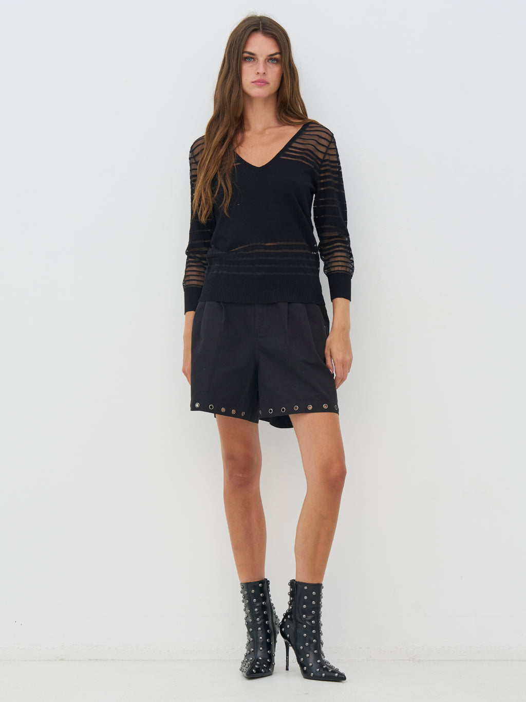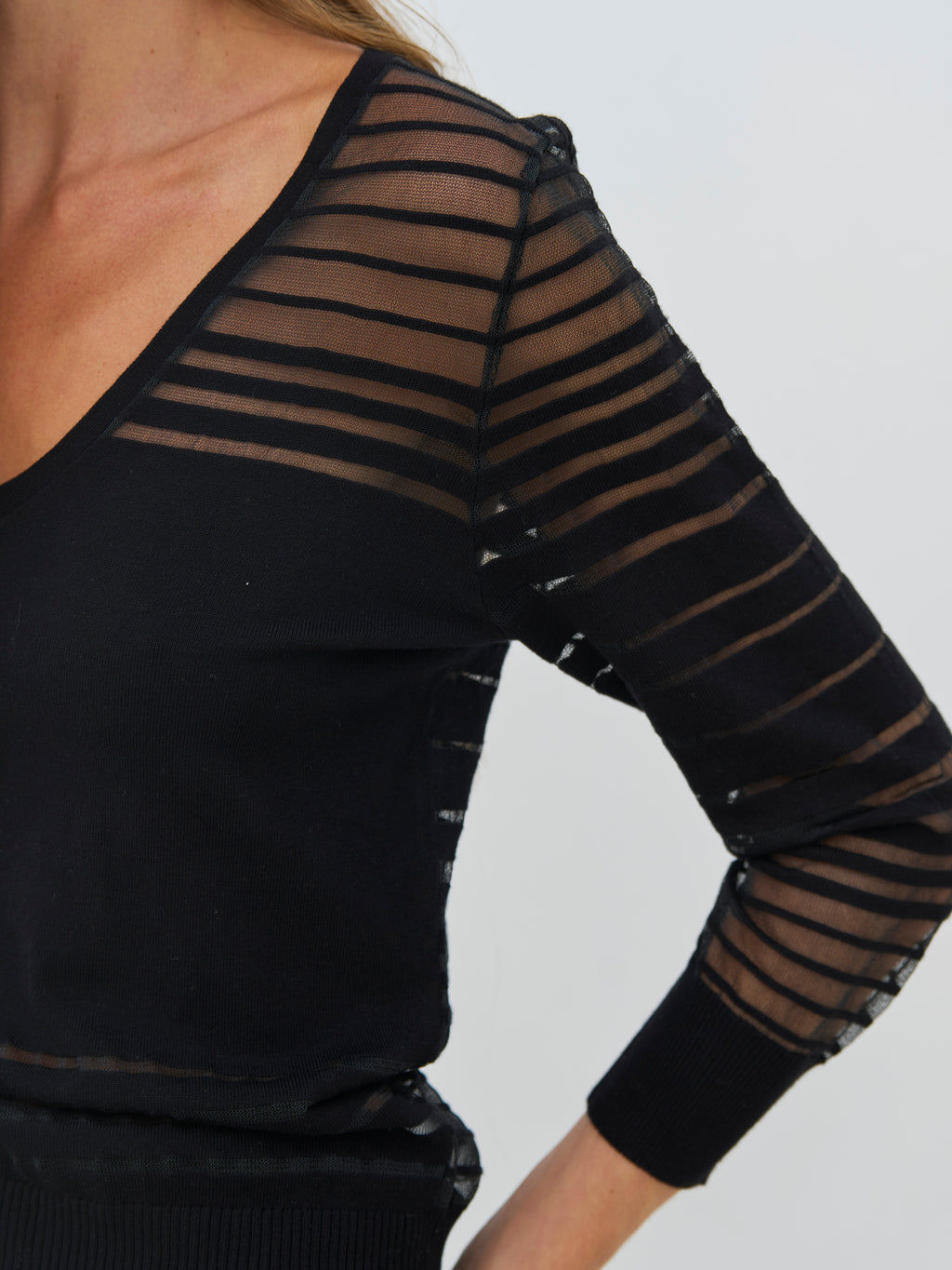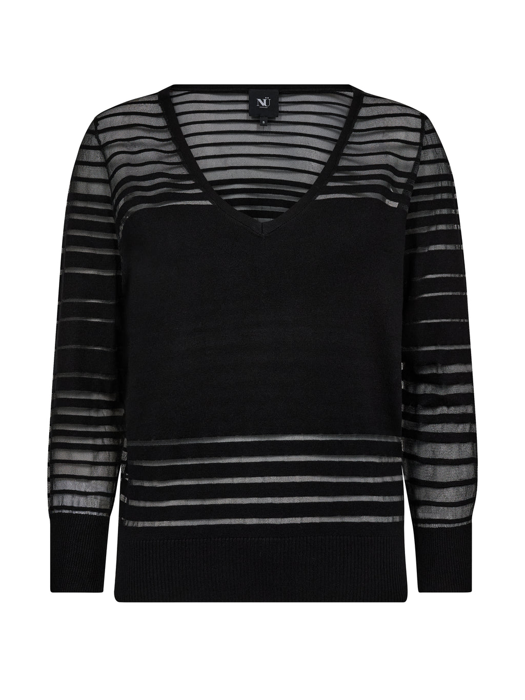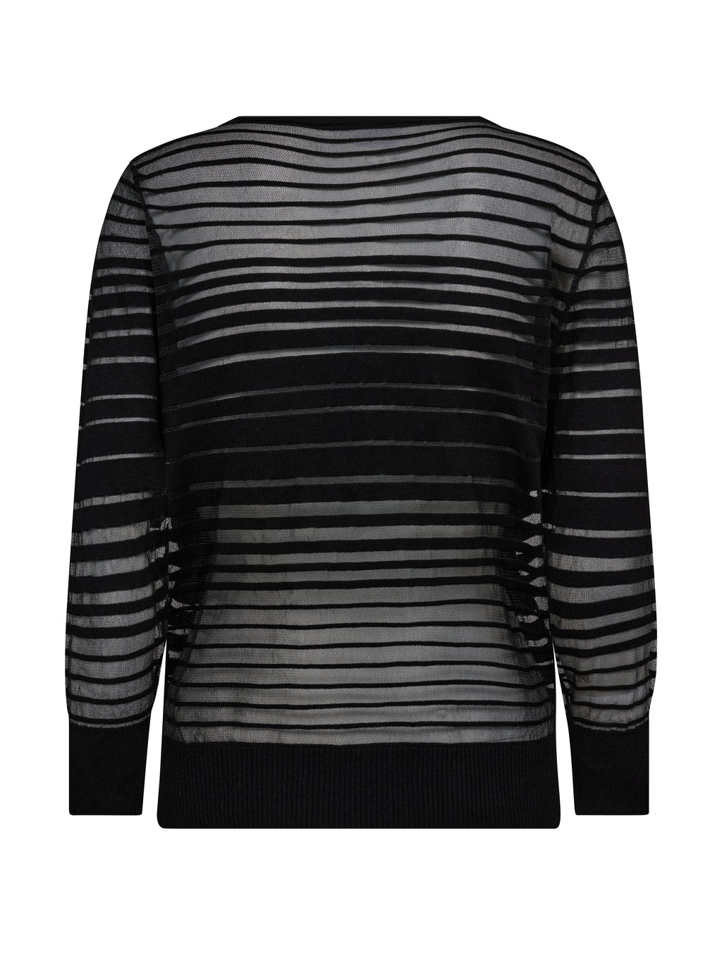 This blouse has a light and feminine expression with a V-neck and long sleeves in transparent quality. The horizontal stripes create a play in the fabric and give the blouse some edge and character. The fit is straight and comfortable, and it works well both on its own and with a top underneath. An easy style that can be worn for both everyday and evening.