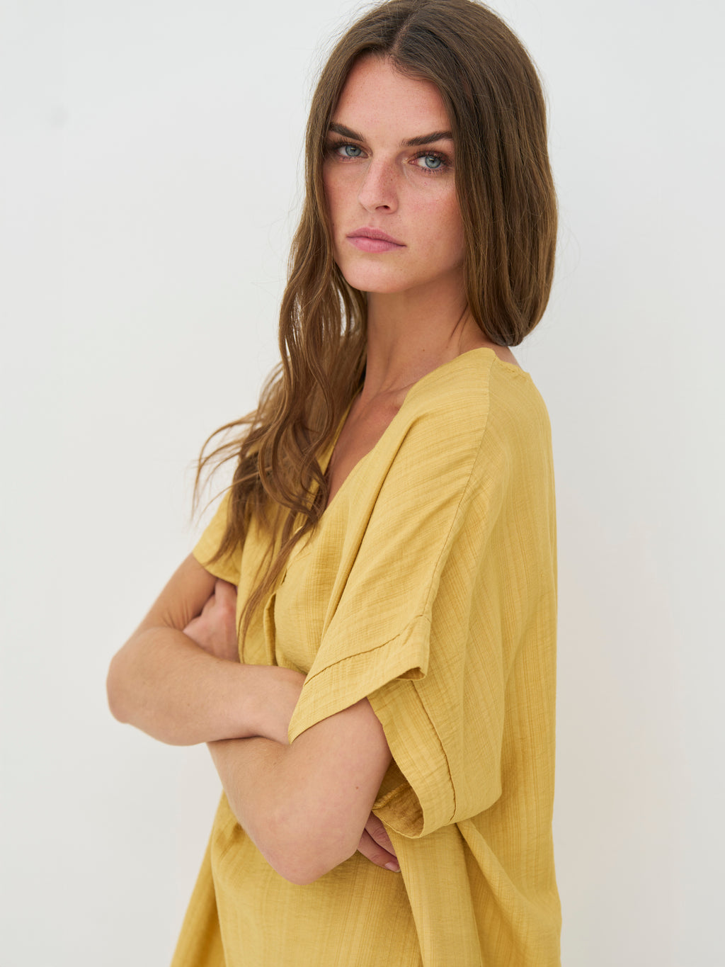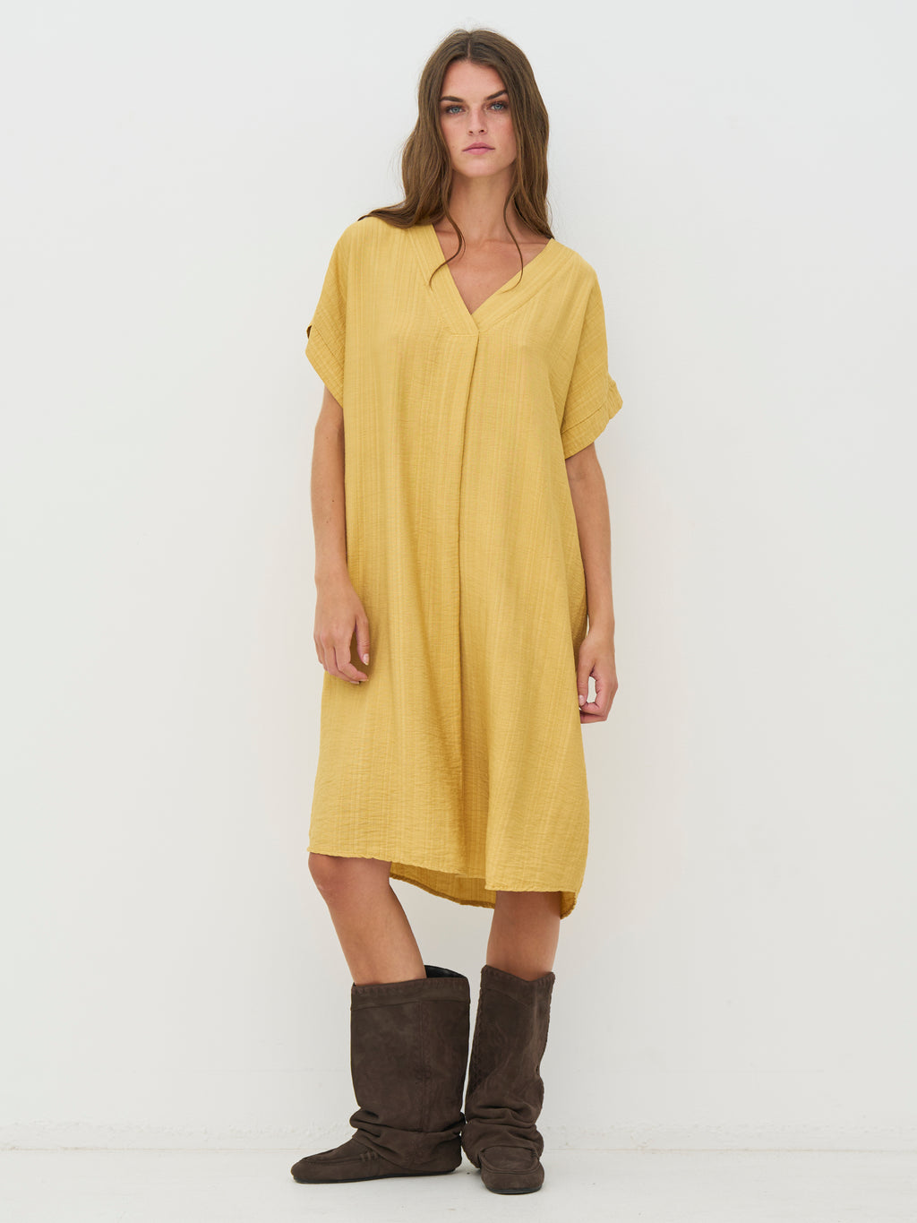 This tunic has a relaxed and simple look with a straight fit that softly drapes along the body. The elegant V-neck creates an open and airy appearance, while the short sleeves keep the silhouette simple and versatile. The length makes it comfortable to wear all day and easy to style, either on its own as a dress or with flat shoes and accessories for a more relaxed look.